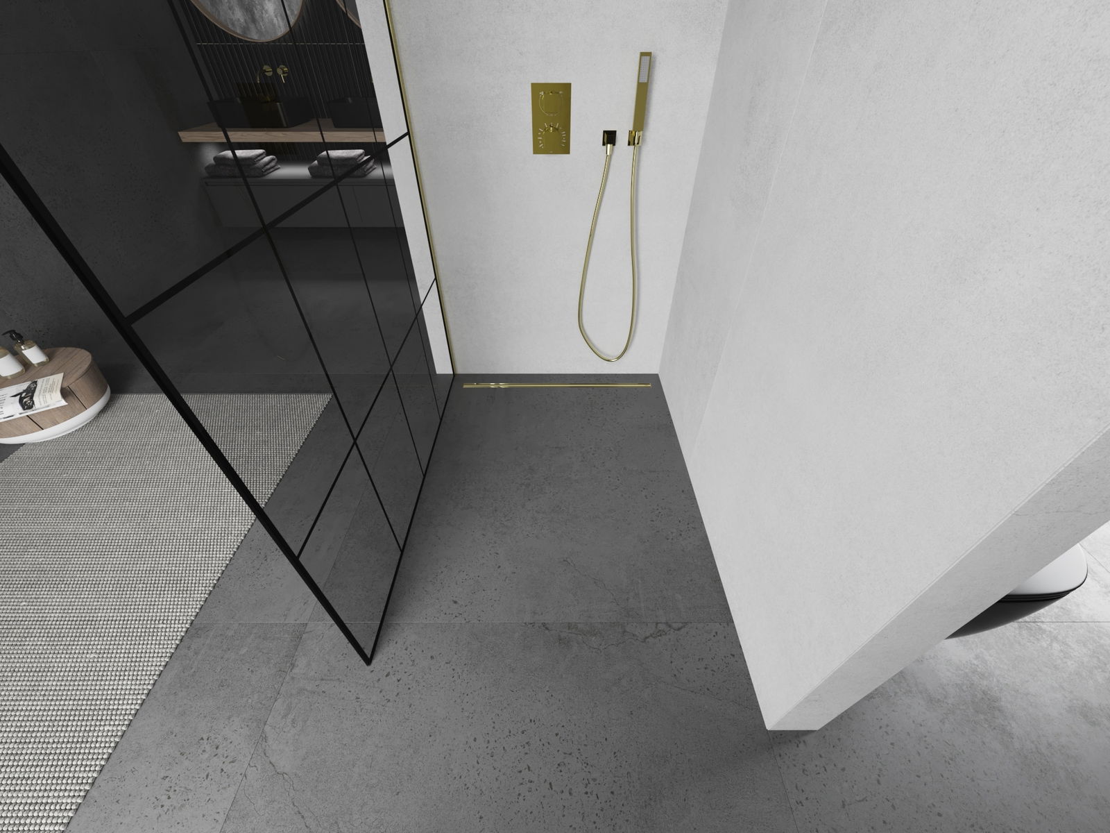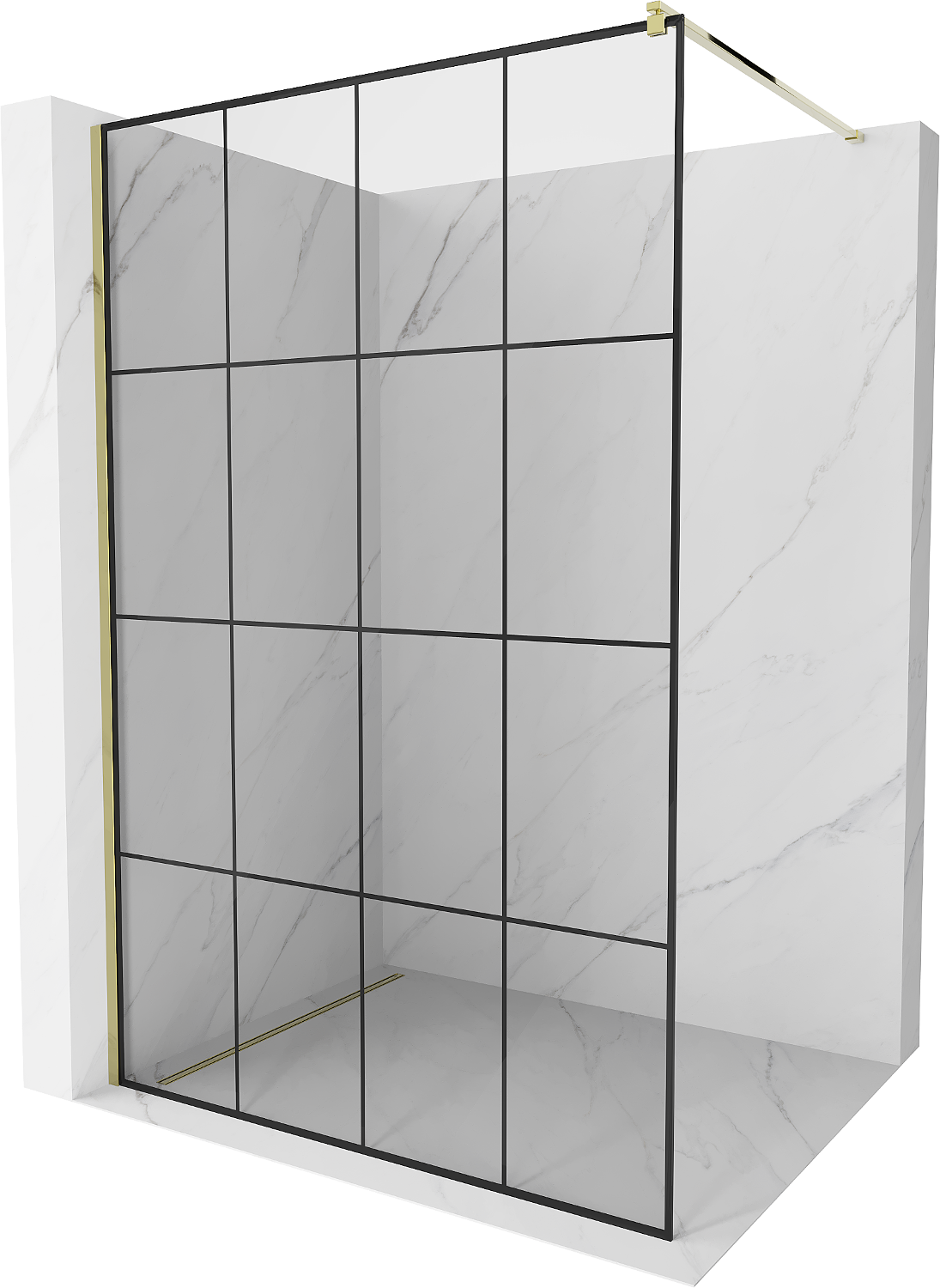 Mexen Kioto dušo sienelė Walk-in 130 x 200 cm, juodas tinklelis 8 mm, auksinė - 800-130-101-50-77