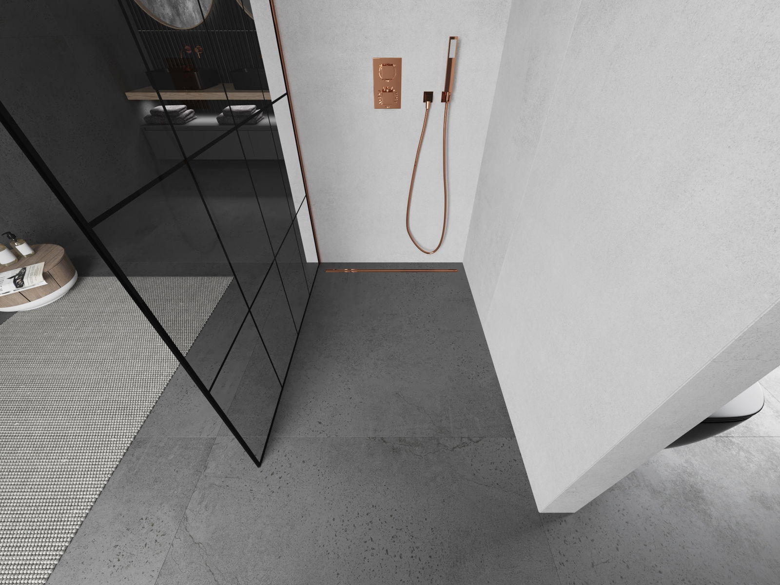 Mexen Kioto dušo siena Walk-in 140 x 200 cm, juodas tinklelis 8 mm, rožinis auksas - 800-140-101-60-77