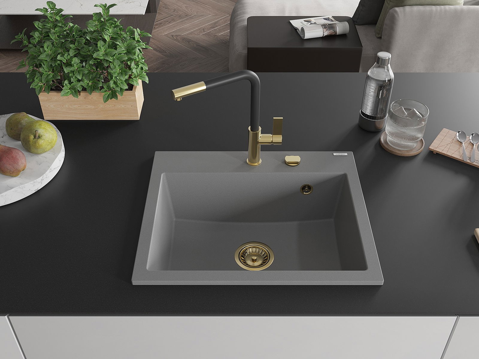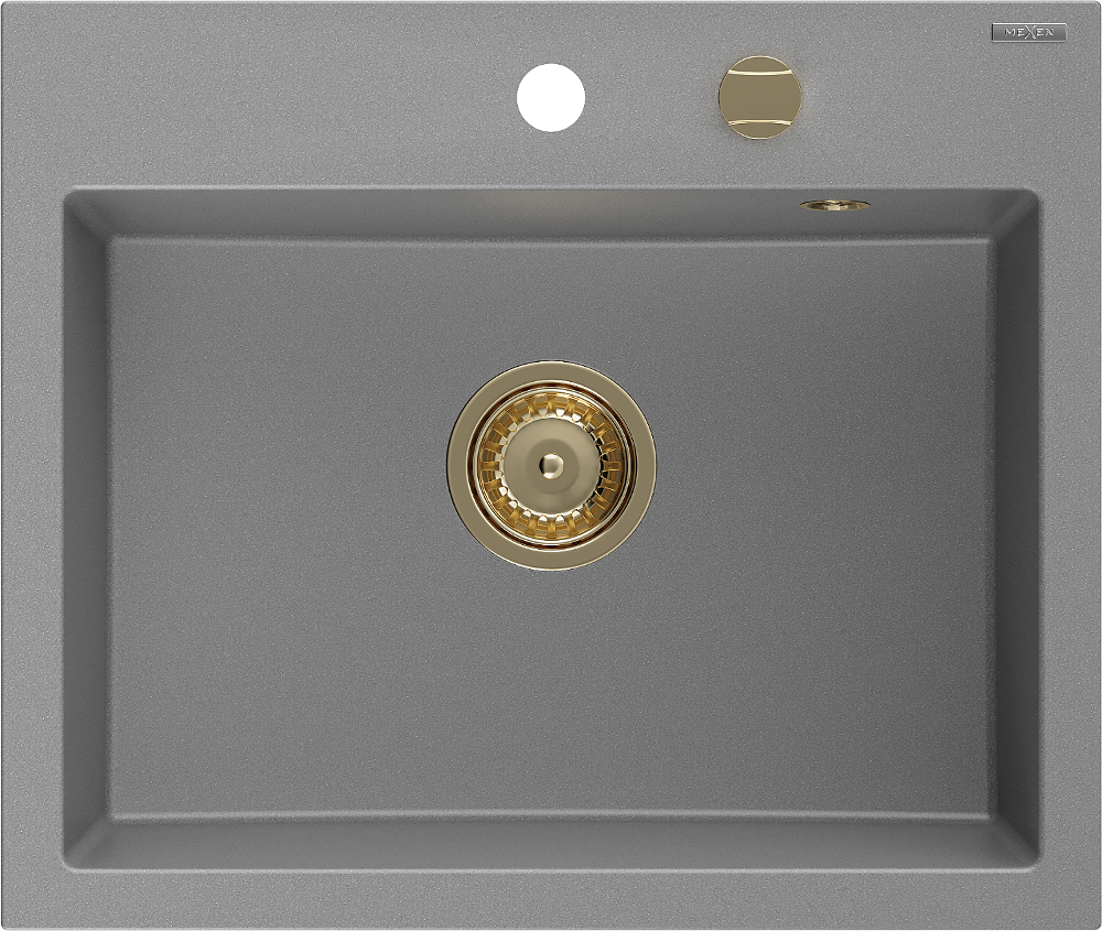 Mexen Oscar granitinė vienos sekcijos plautuvė 580 x 490 mm, pilka, auksinis sifonas - 6519581000-71-G