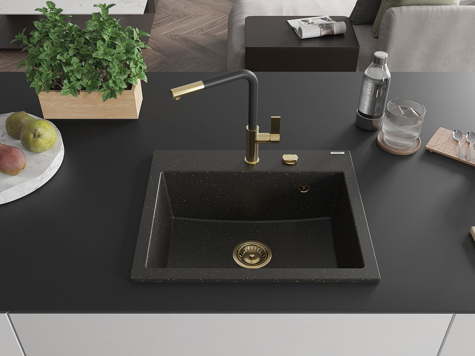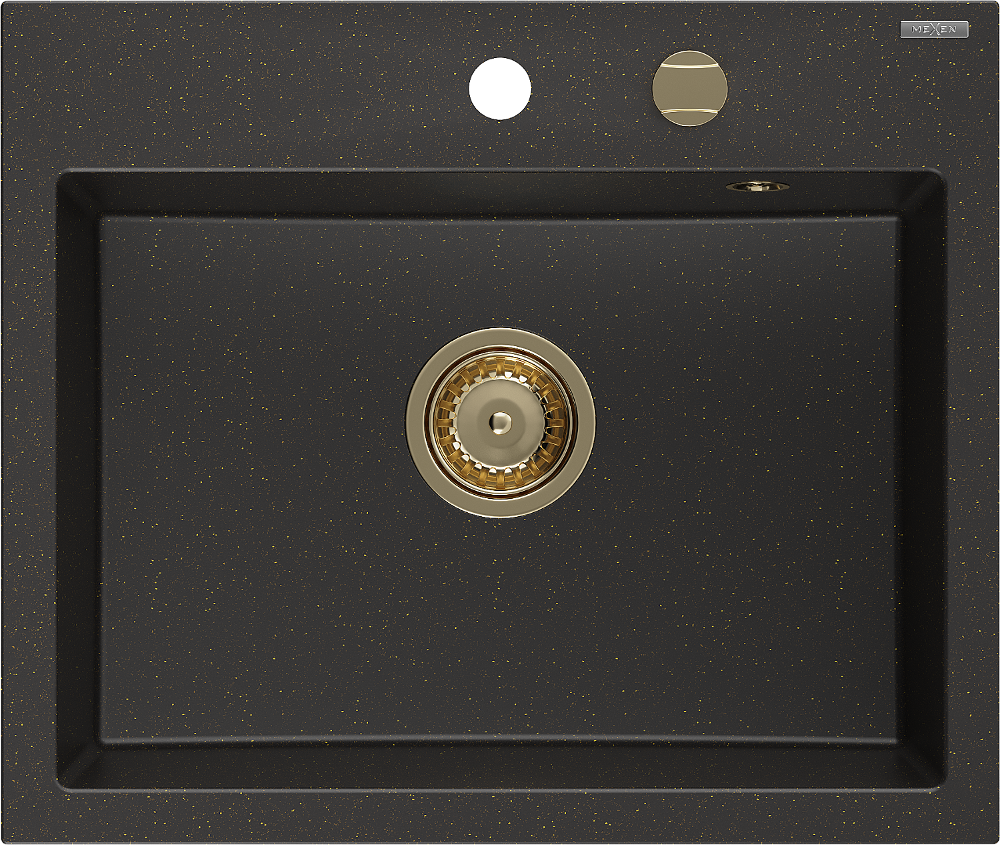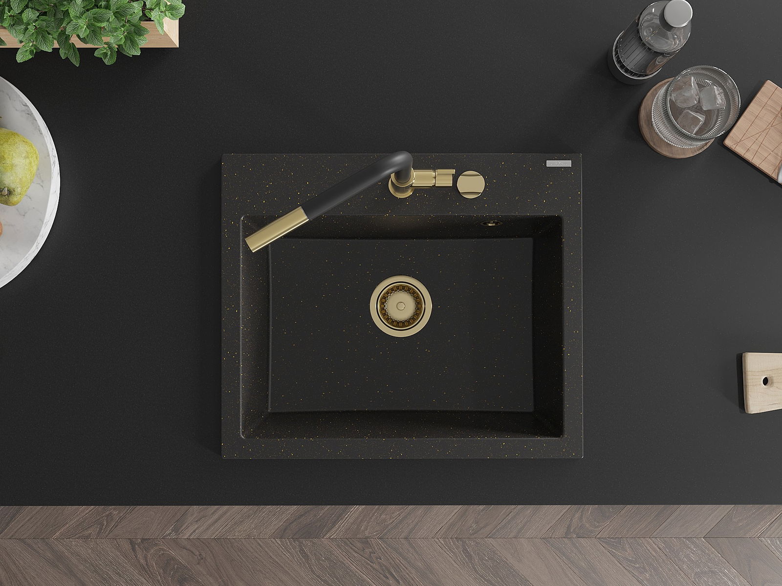 Mexen Oscar granitinis 1 dubens plautuvė 580 x 490 mm, juoda/auksinė metalika, sifonas auksinis - 6519581000-75-G