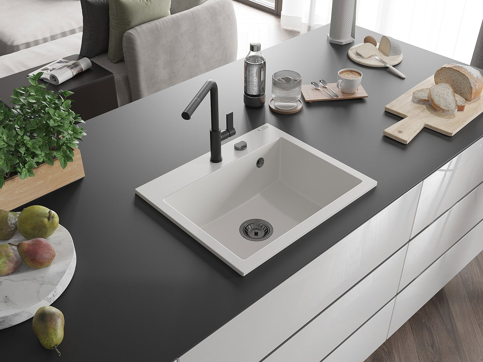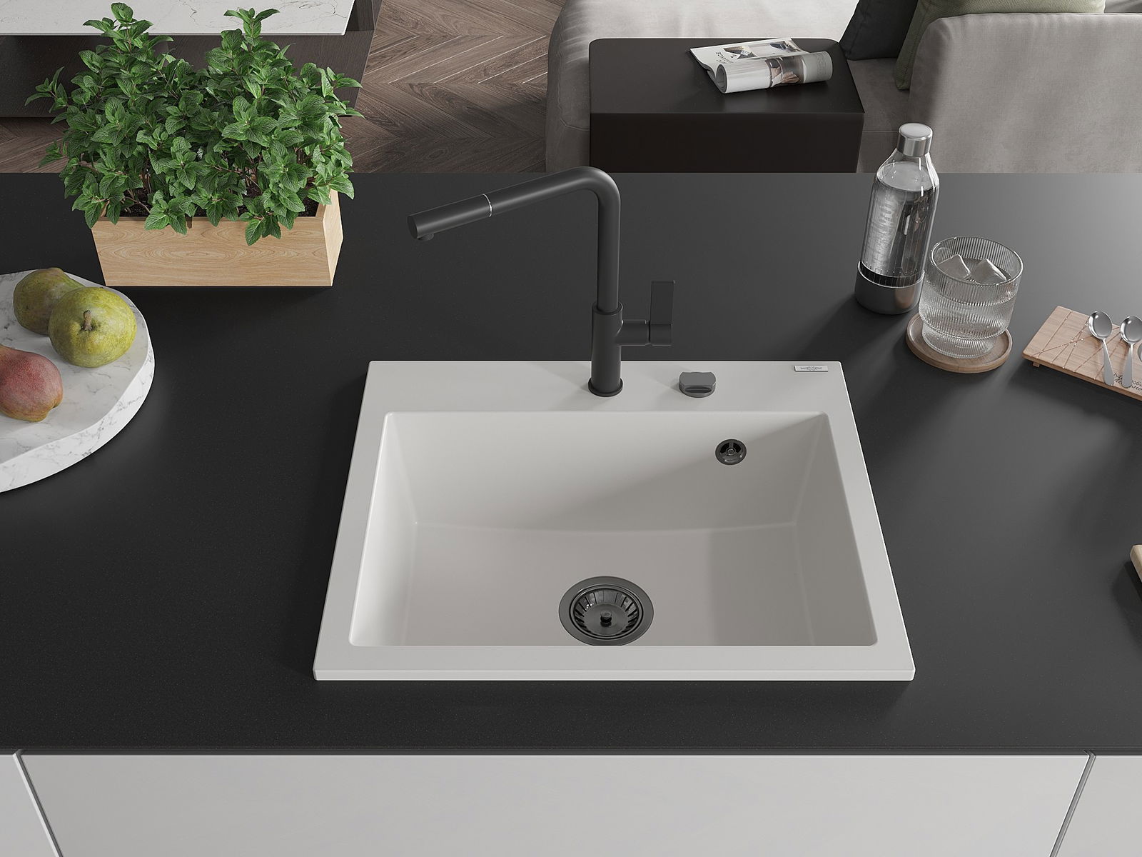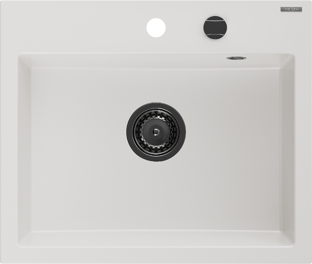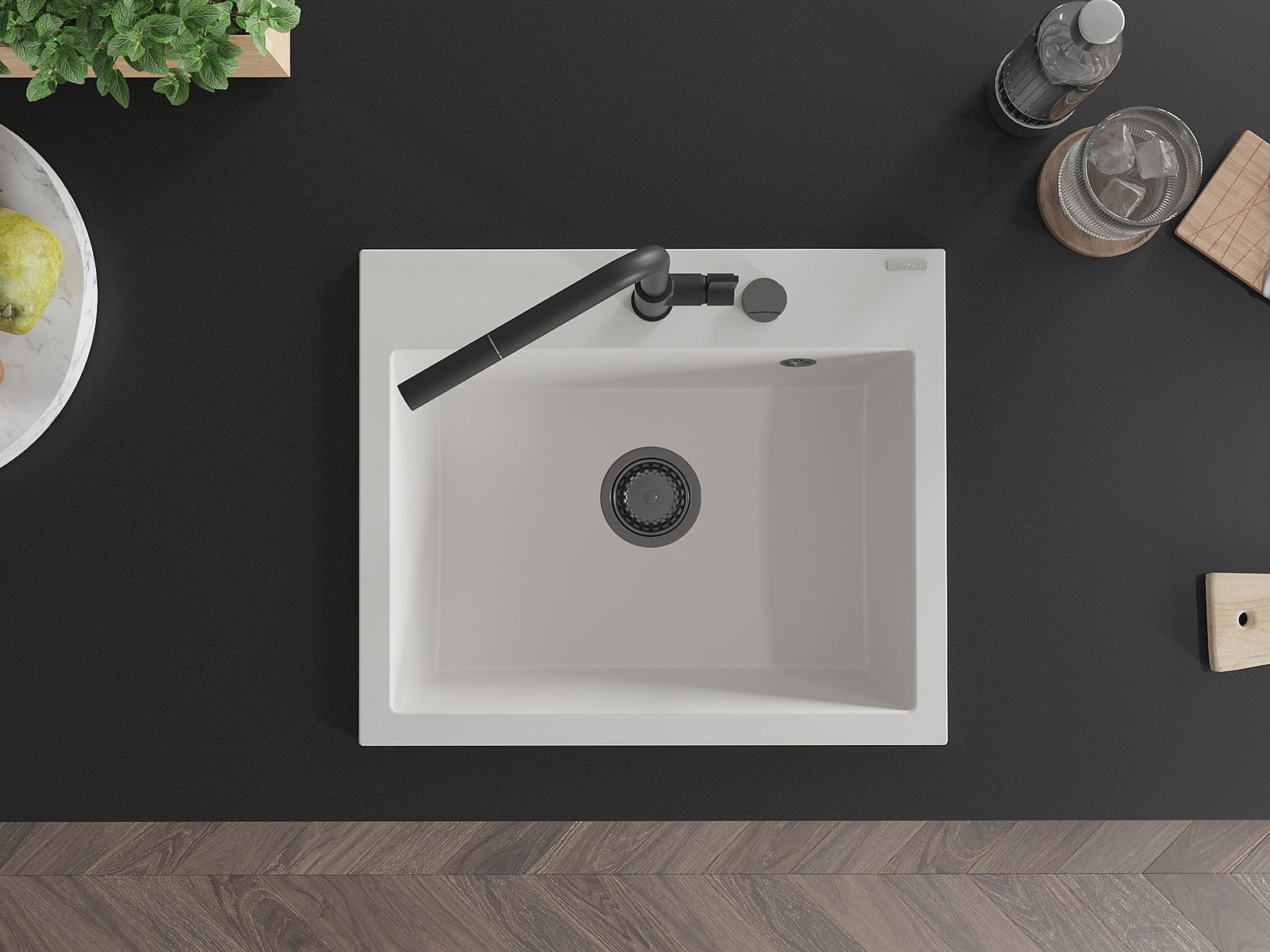 Mexen Oscar granito kriauklė su vienu skyriumi 580 x 490 mm, balta, juodas sifonas - 6519581000-20-B