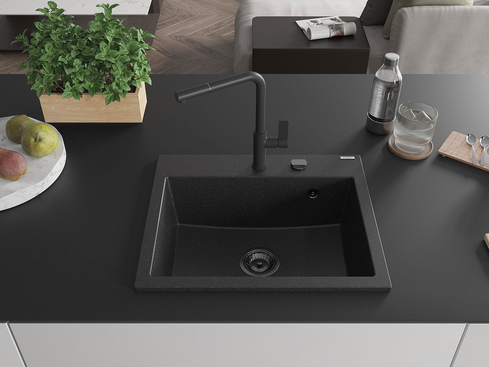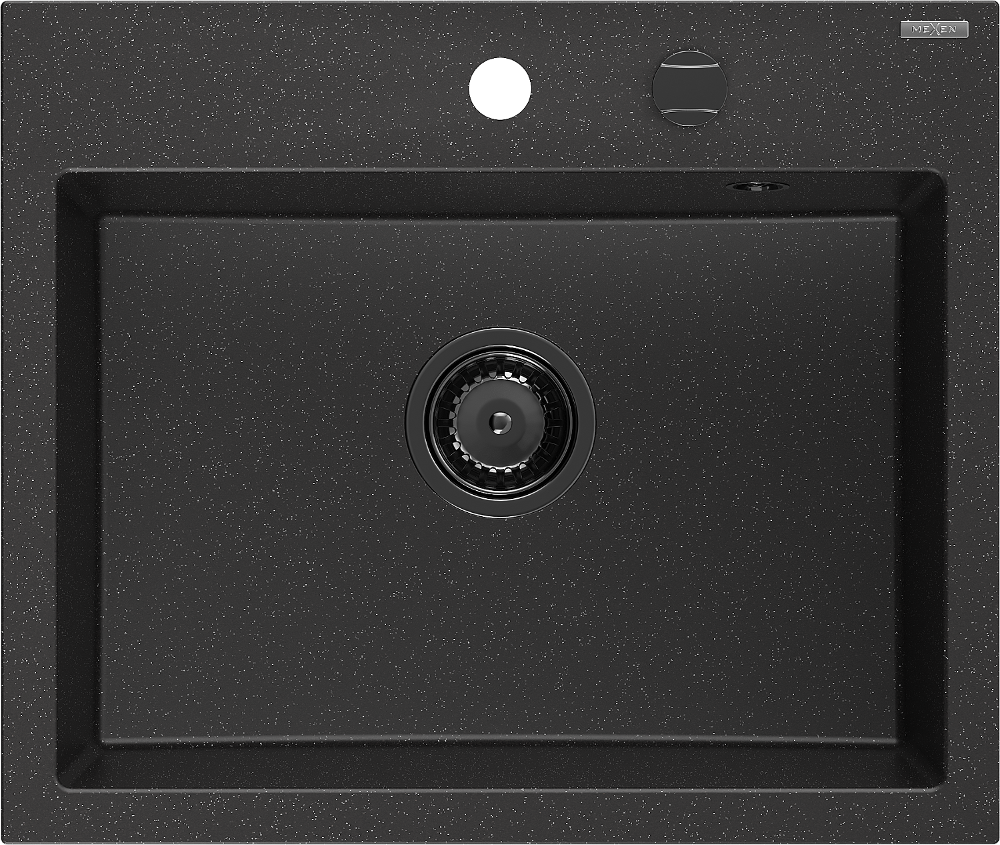Mexen Oscar granito plautuvė su viena kamera 580 x 490 mm, juodas/sidabrinis metalikas, juodas sifonas - 6519581000-73-B