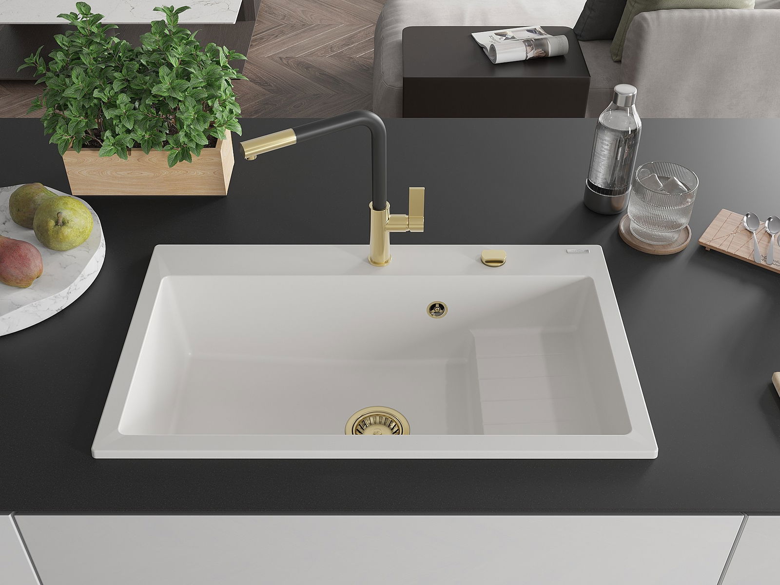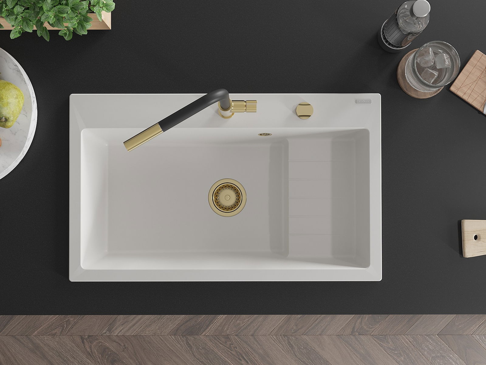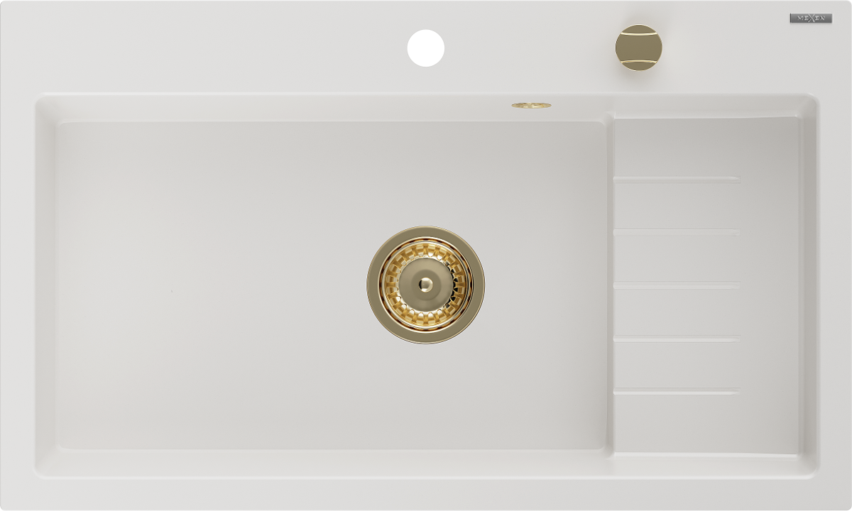 Mexen Omar granito plautuvė vienos kameros 800 x 480 mm, balta, aukso sifonas - 6520801005-20-G