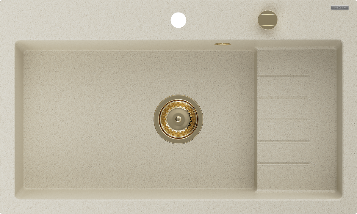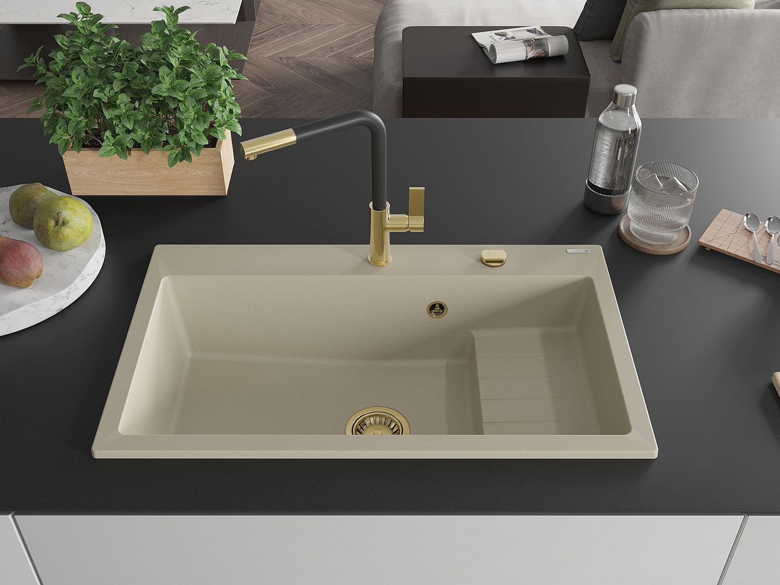 Mexen Omar granitinė vienos kameros virtuvės kriauklė 800 x 480 mm, smėlio spalvos, sifonas auksinis - 6520801005-69-G