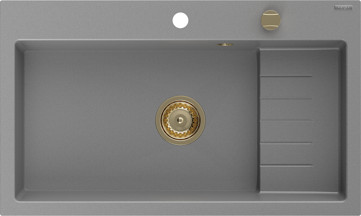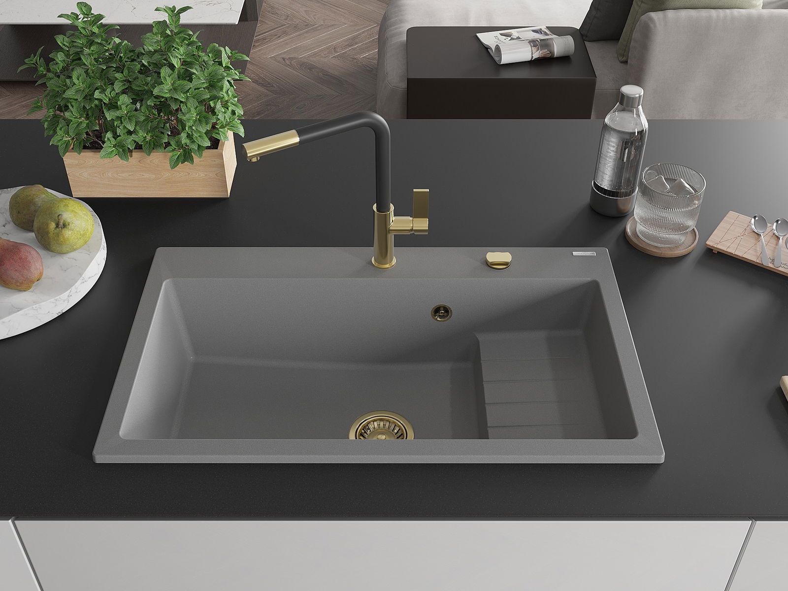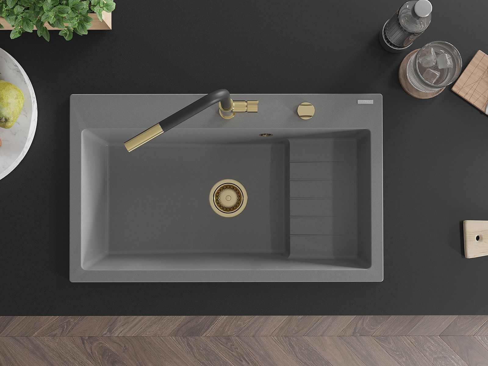 Mexen Omar granito plautuvė 1-skyrius 800 x 480 mm, pilka, aukso sifonas - 6520801005-71-G