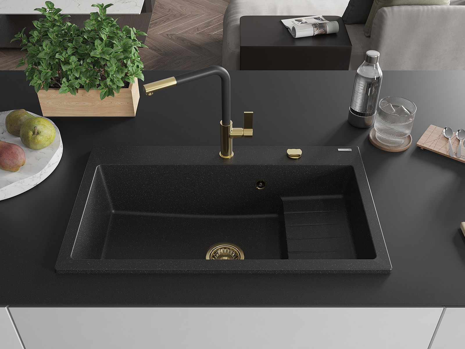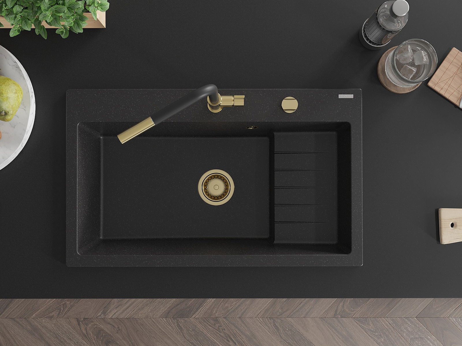 Mexen Omar granitinė vienos sekcijos plautuvė 800 x 480 mm, juoda/sidabrinė metaliko spalva, aukso sifonas - 6520801005-73-G