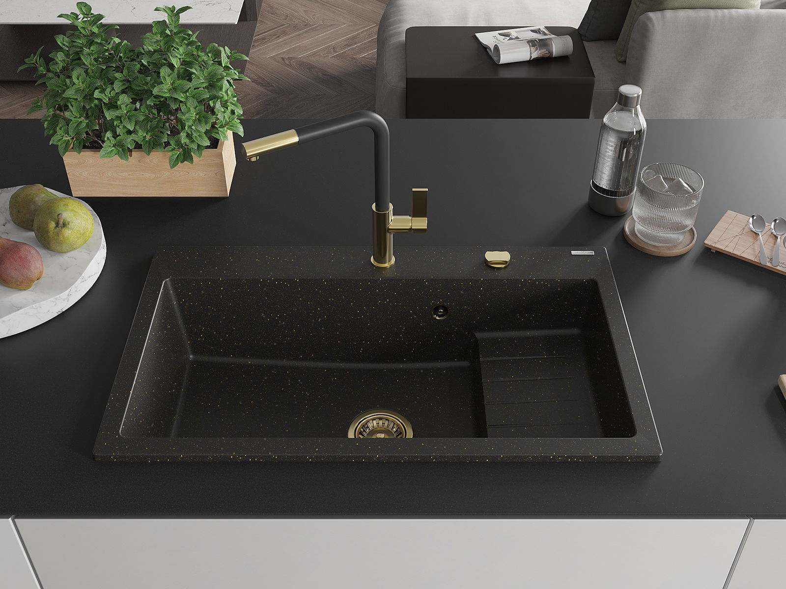 Mexen Omar granitinis plautuvė 1 kamerų 800 x 480 mm, juoda/auksinė metalika, sifonas auksinis - 6520801005-75-G