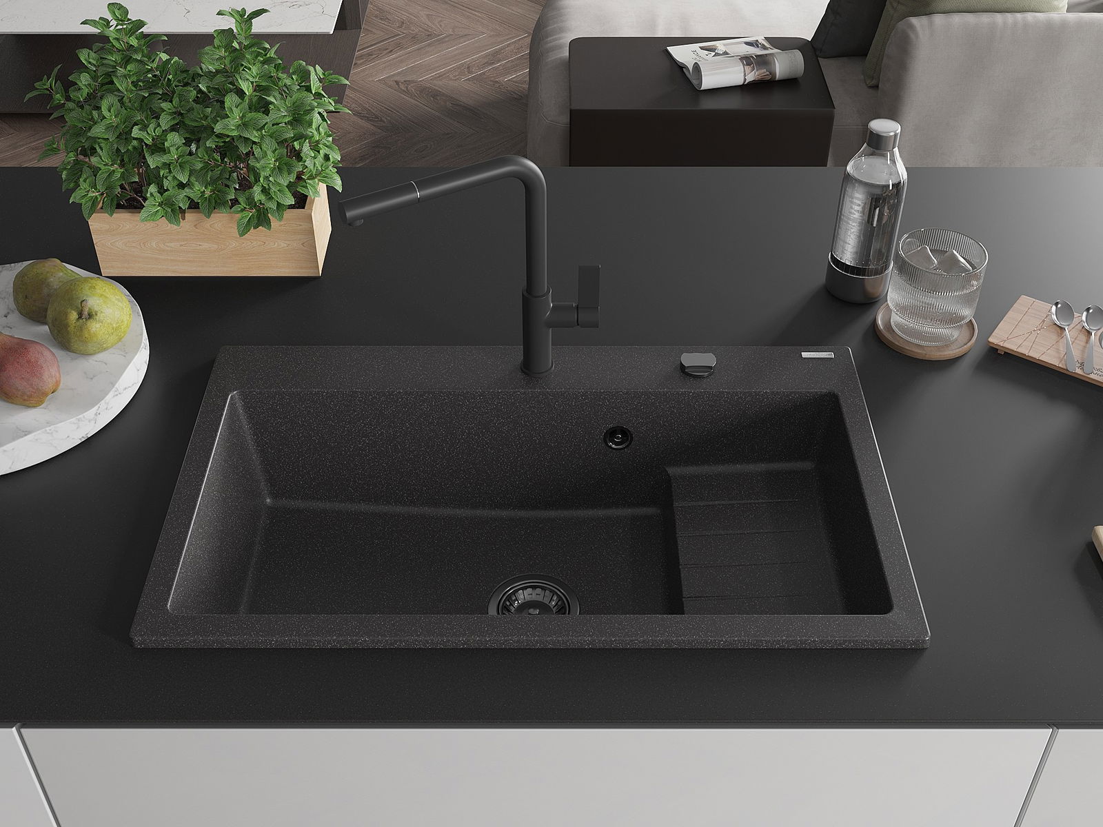 Mexen Omar granitinis vienos kameros plautuvė 800 x 480 mm, juodas taškuotas, juodas sifonas - 6520801005-76-B