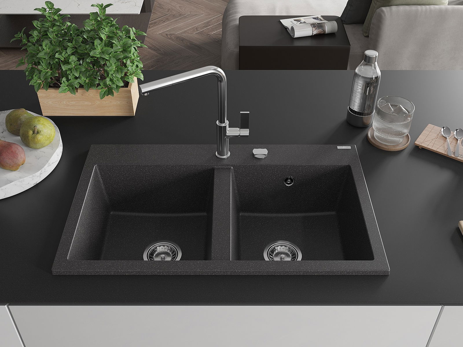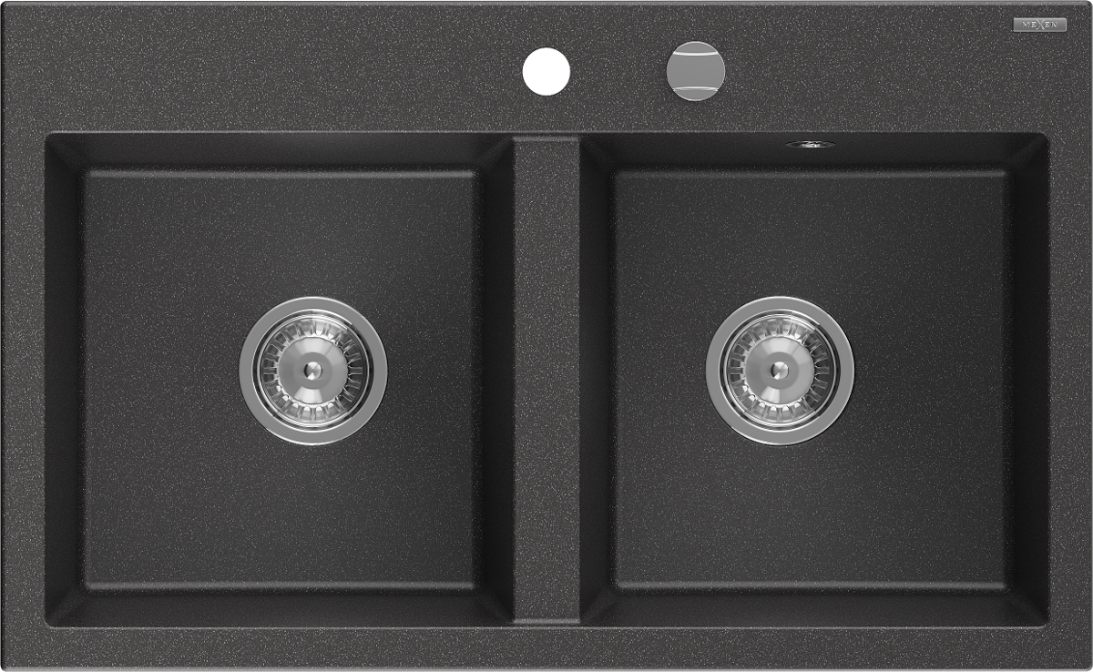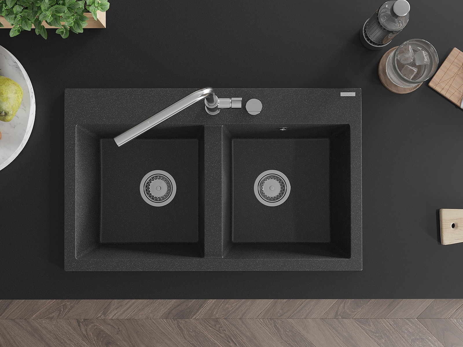Mexen Hektor granitinė virtuvinė kriauklė 2-jų kamerų 800 x 480 mm, juoda su dėmelėmis, chromuotas sifonas - 6521802000-76