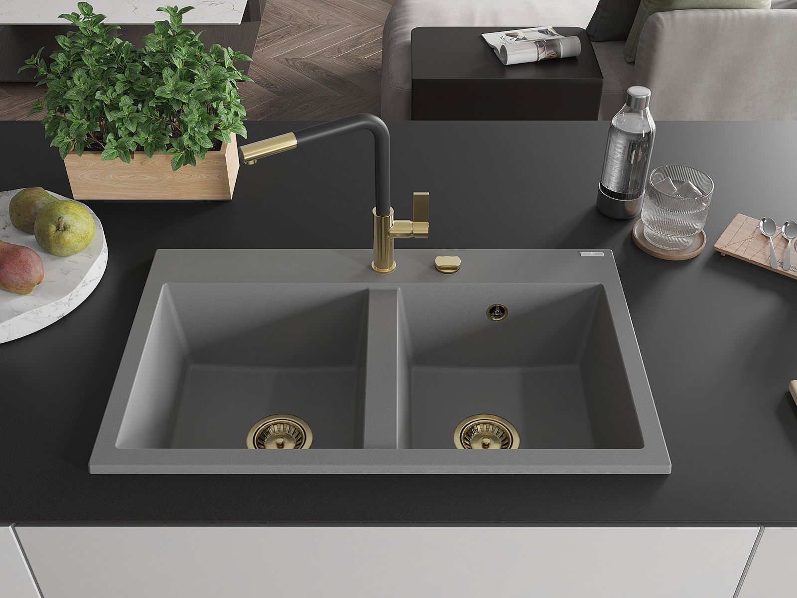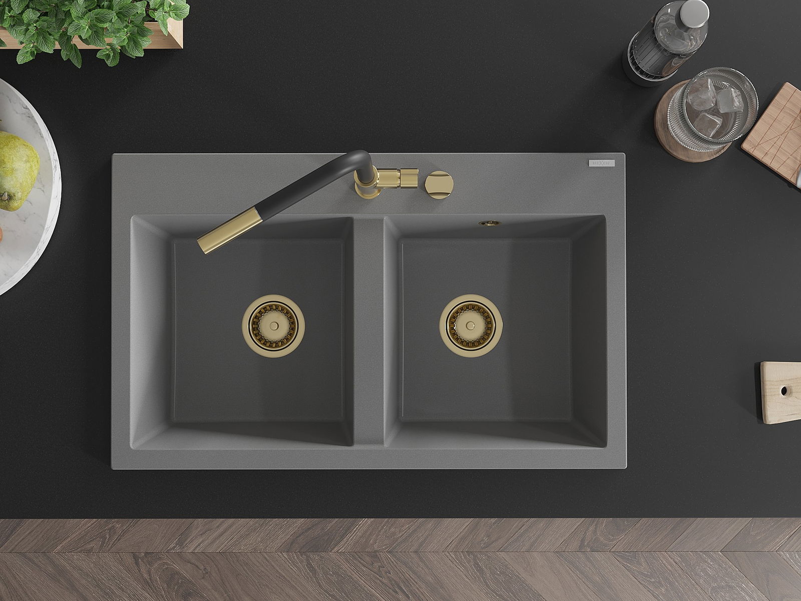 Mexen Hektor granito plautuvė 2 kamerų 800 x 480 mm, pilka, auksinė sifonas - 6521802000-71-G