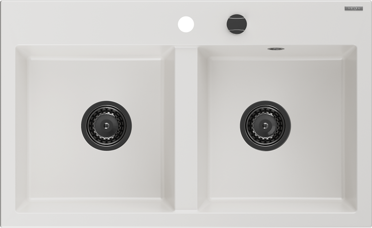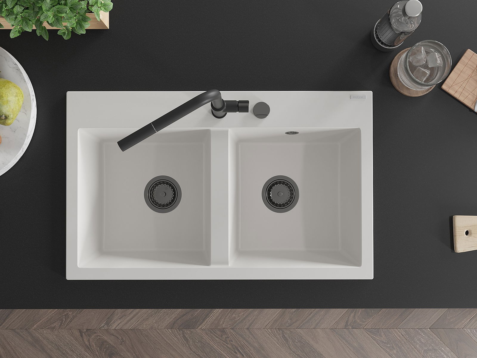 Mexen Hektor granito plautuvė 2-jų skyrių 800 x 480 mm, balta, juodas sifonas - 6521802000-20-B