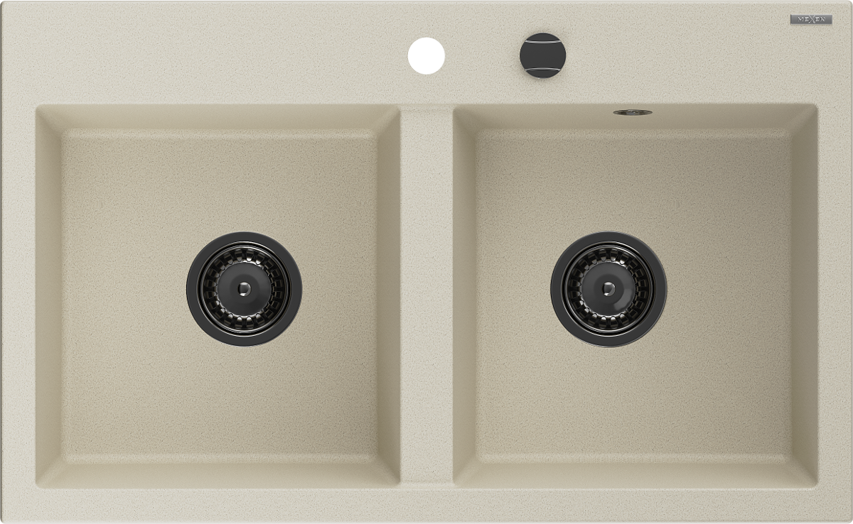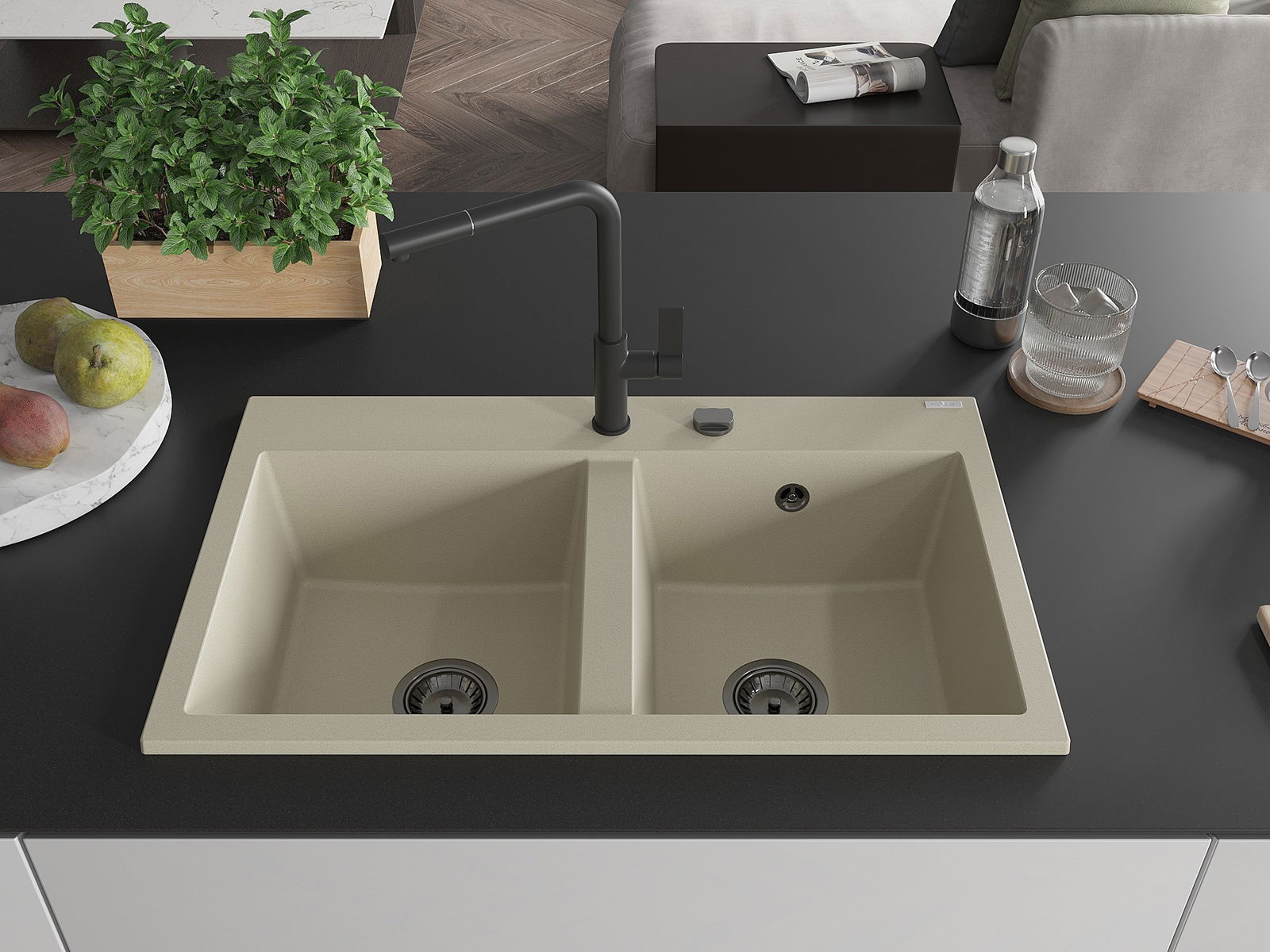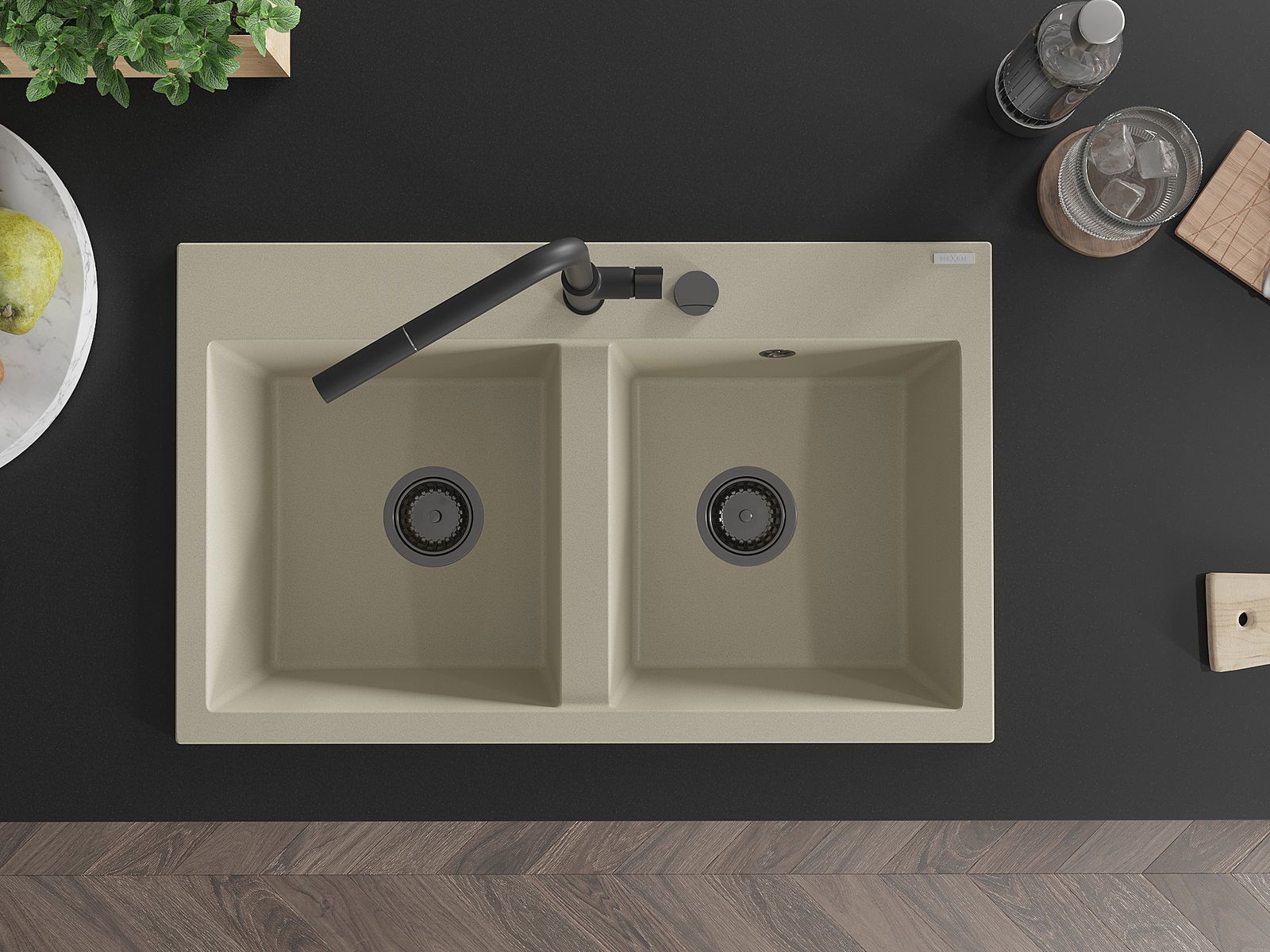 Mexen Hektor granitinė dviejų skyrelių plautuvė 800 x 480 mm, smėlio spalvos, juodas sifonas - 6521802000-69-B