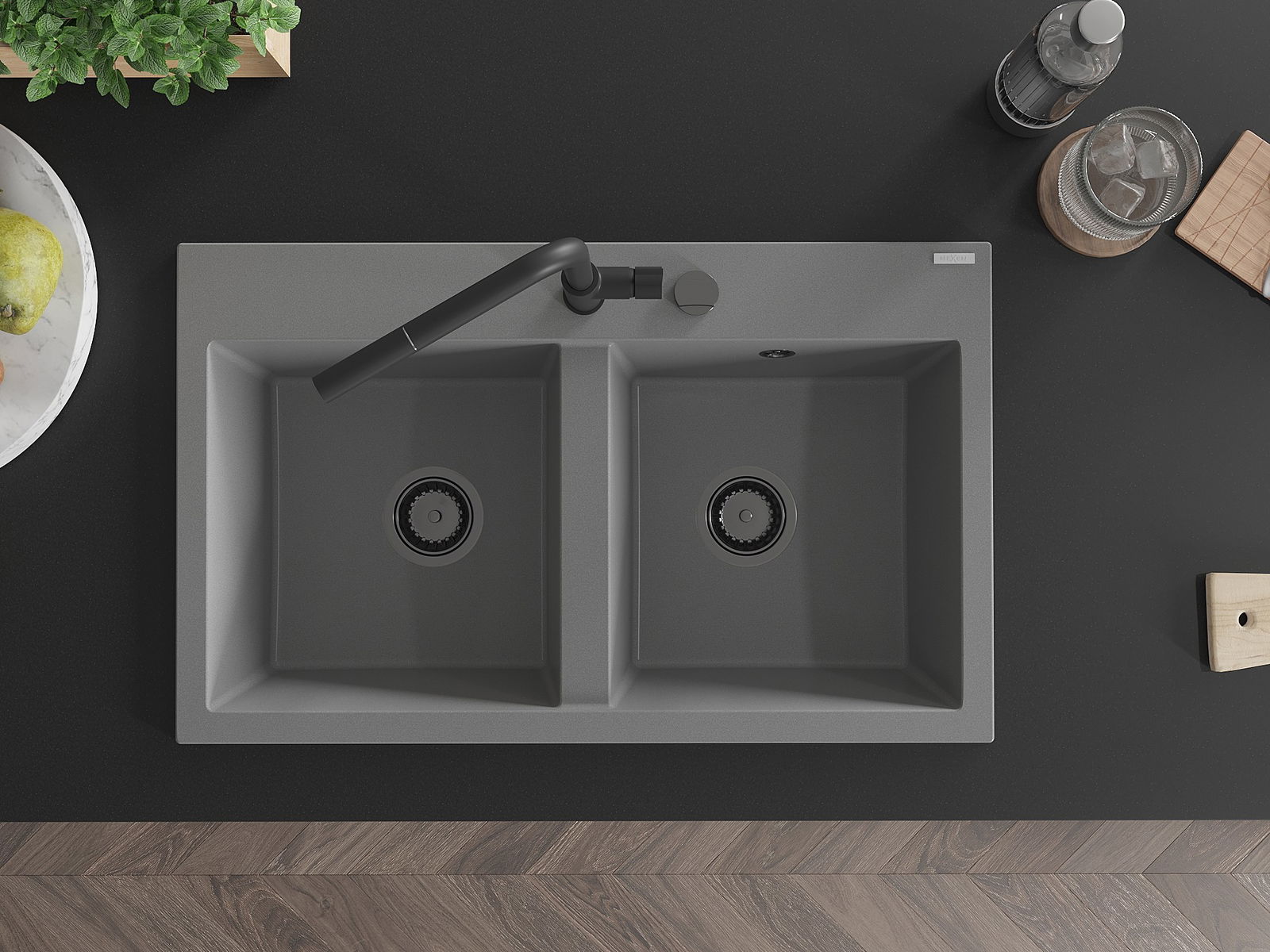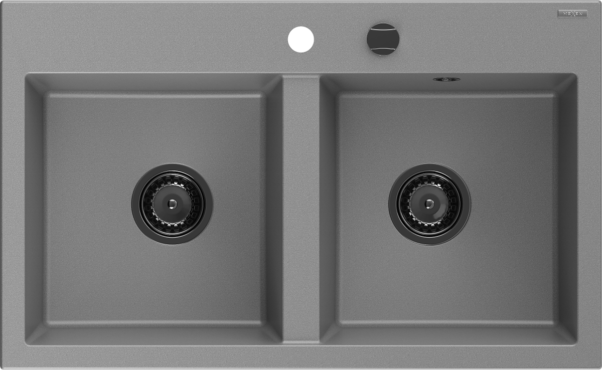 Mexen Hektor granitinė dviejų skyrių kriauklė 800 x 480 mm, pilka, juodas sifonas - 6521802000-71-B