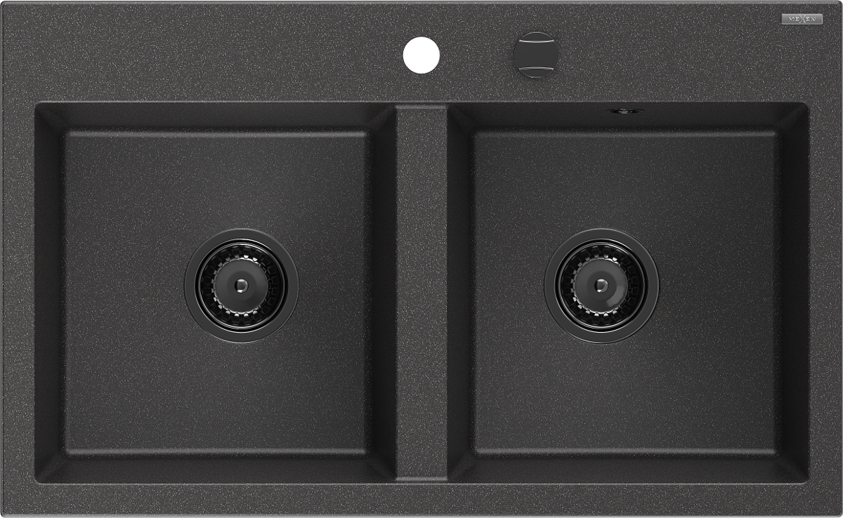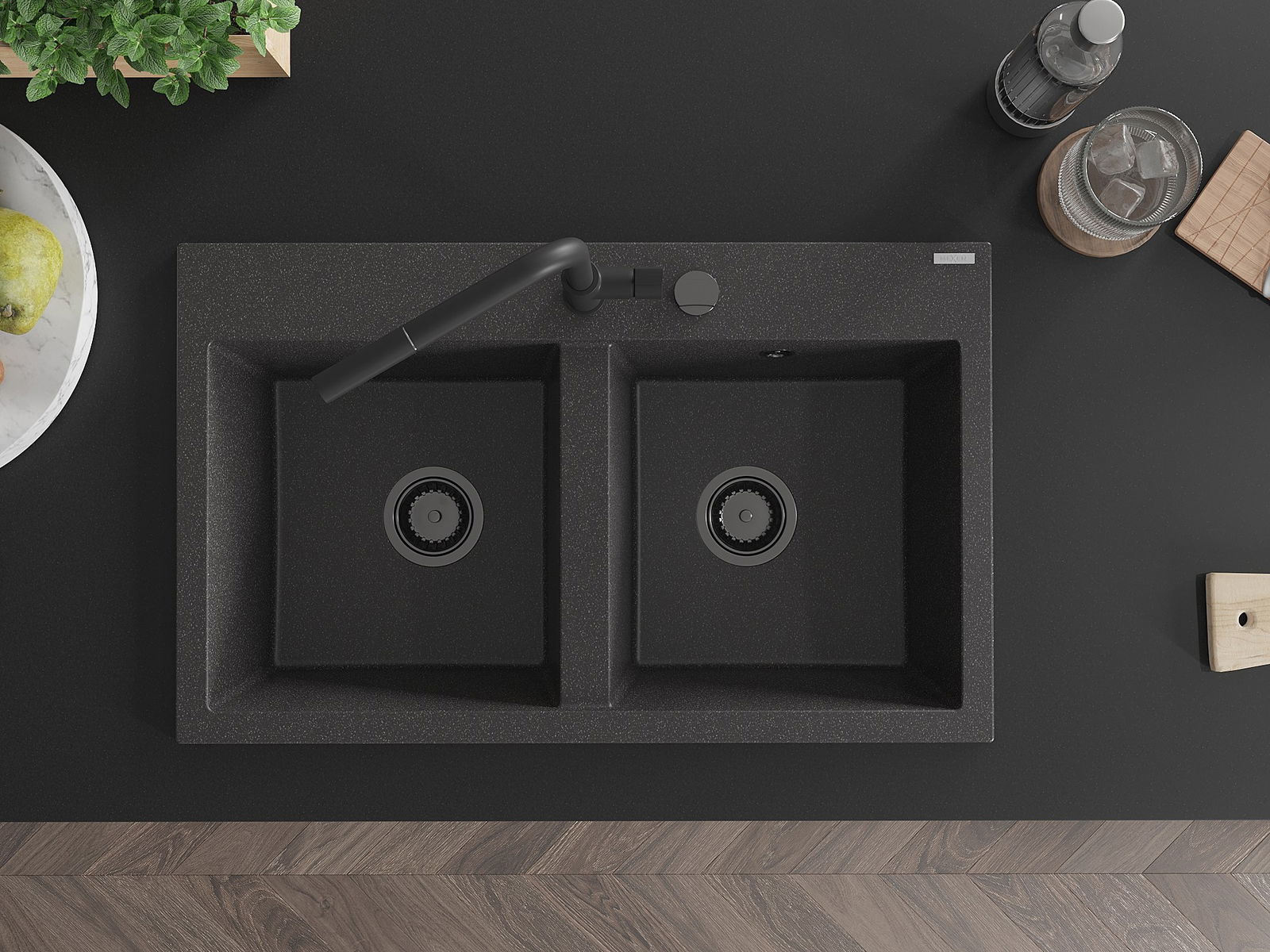 Mexen Hektor granitinė plautuvė su dviem kameromis 800 x 480 mm, juoda su taškeliais, juodas sifonas - 6521802000-76-B