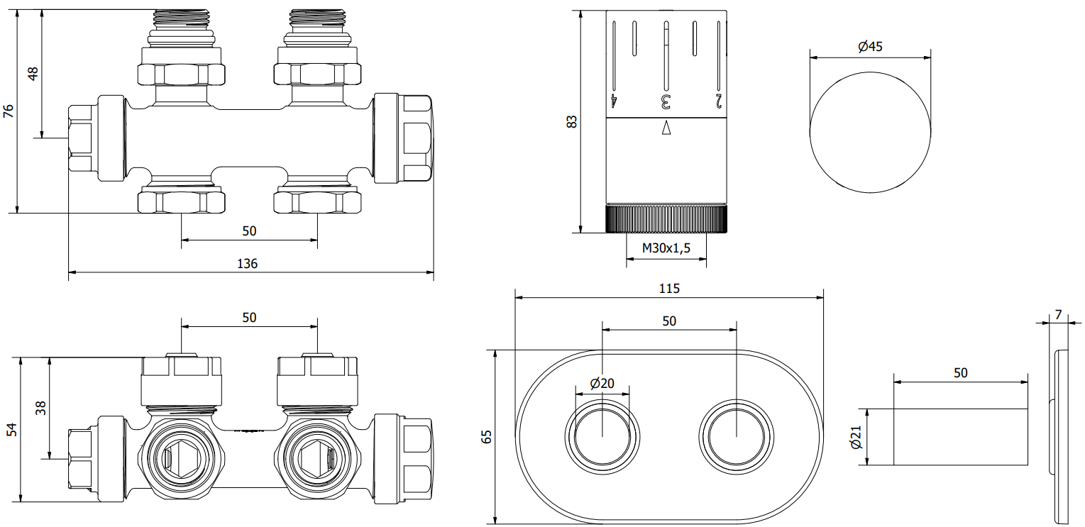 Komplekte yra papildomi jungtys daugiasluoksnėms 16x2 mm vamzdžiams ir vario vamzdžiams 15 mm