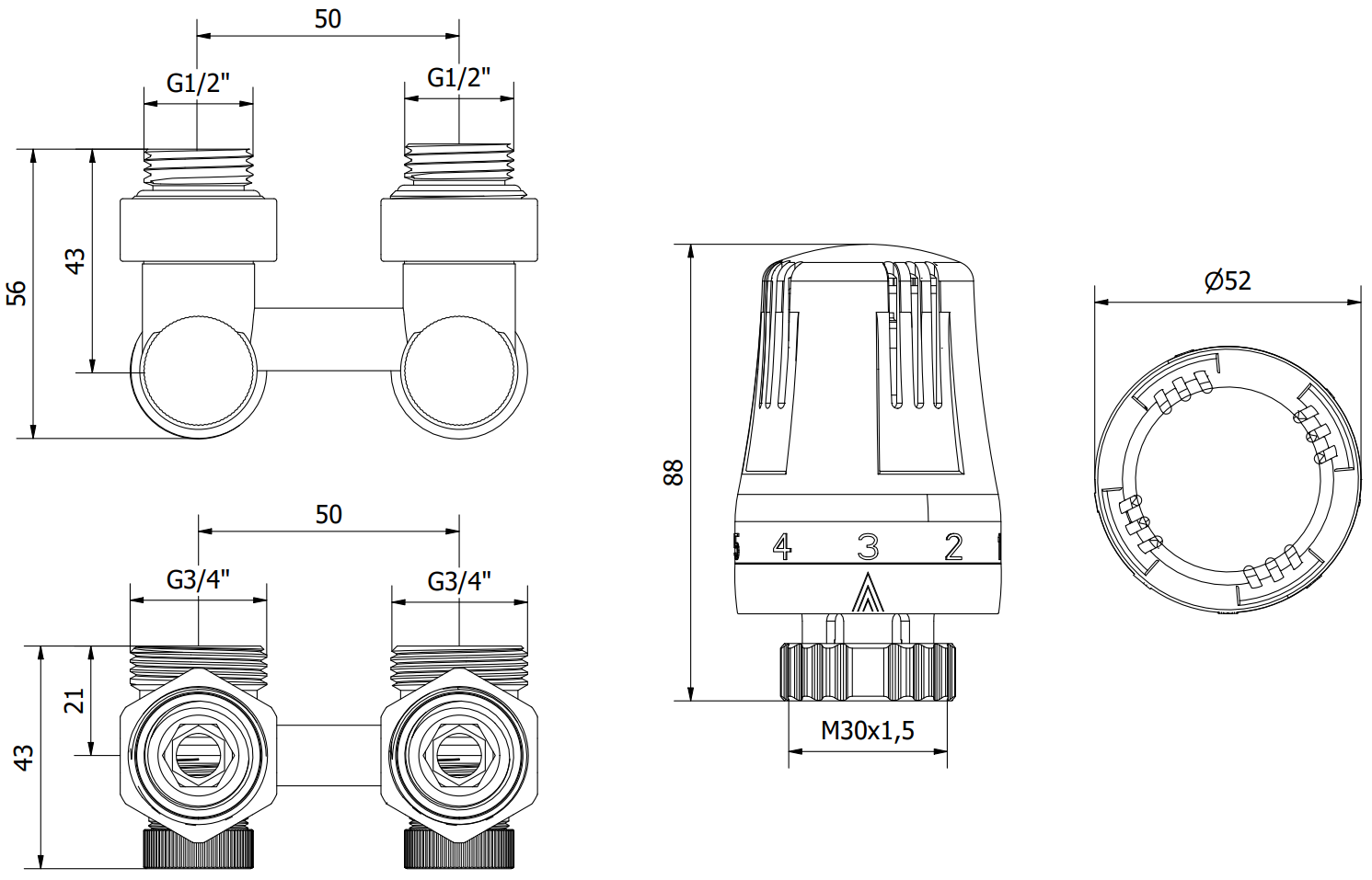 Vožtuvo jungties skersmuo: G 1/2" ir G 3/4"