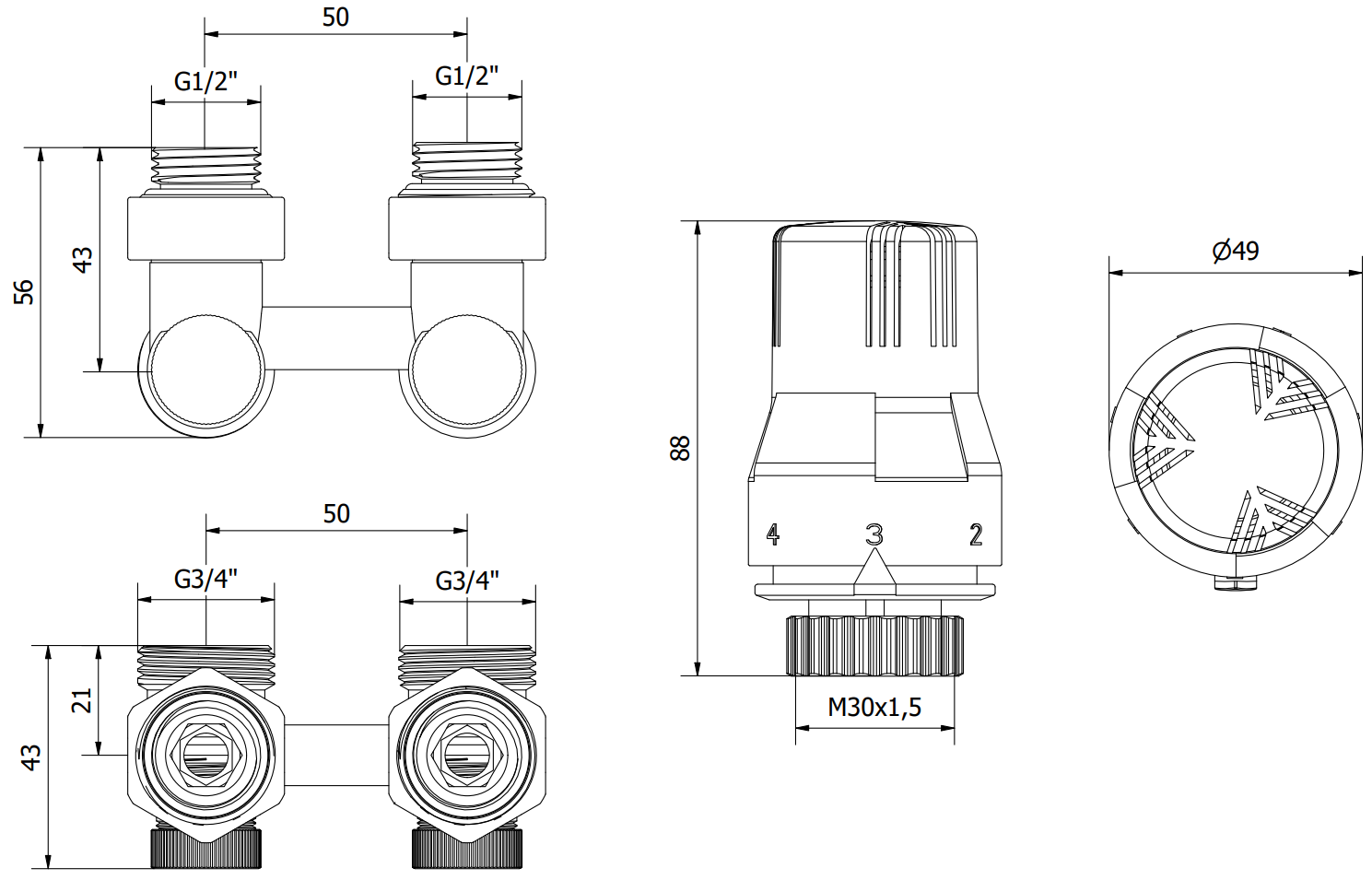 Vožtuvo jungties skersmuo: G 1/2" ir G 3/4"