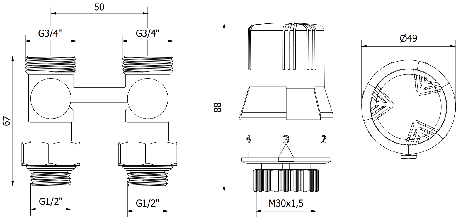 Vožtuvo jungties skersmuo: G 1/2" ir G 3/4"