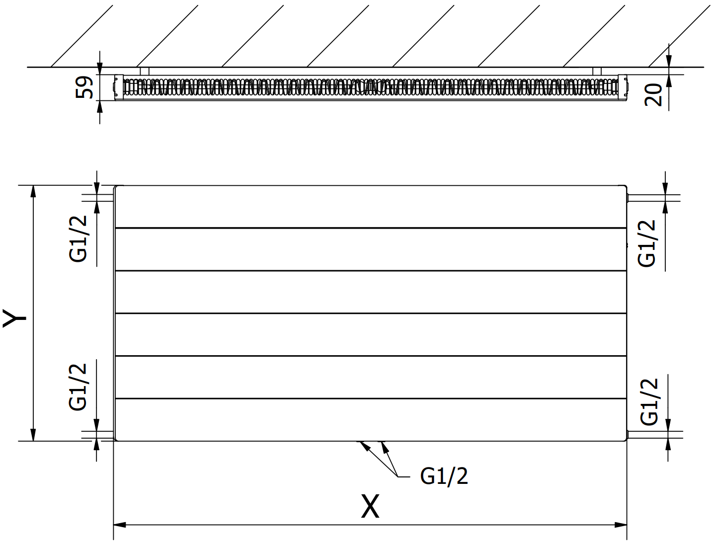 Nuotraukos rodo radiatorių, kurio dydis yra 600 x 1200 mm.