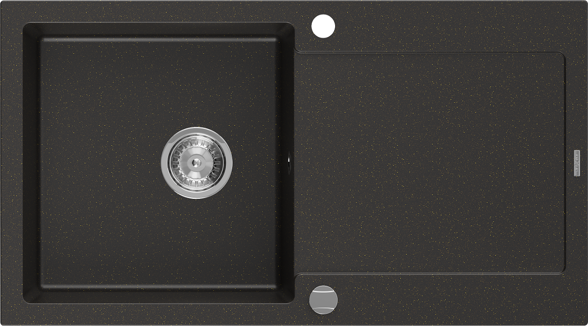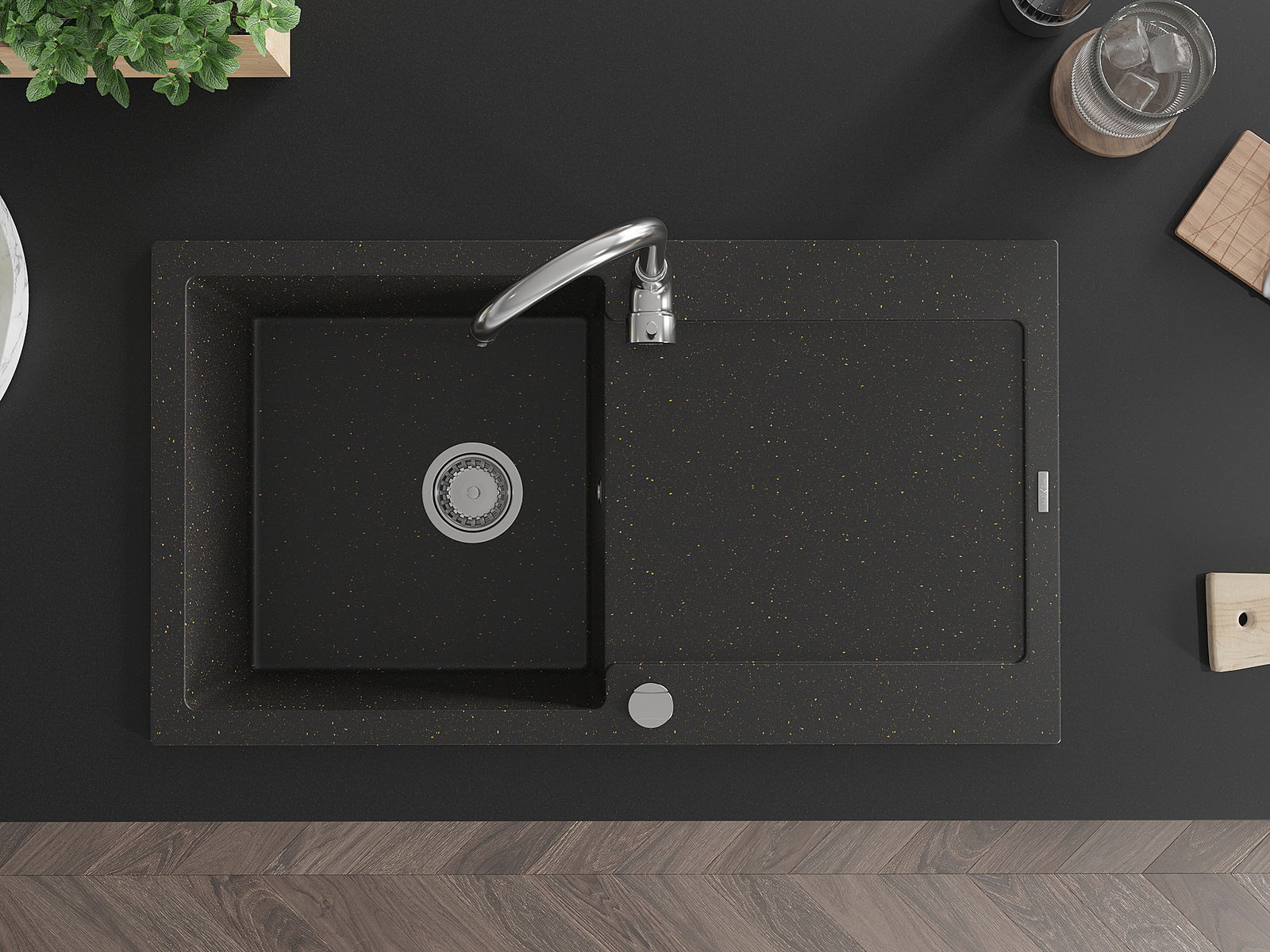Mexen Leo granitinė vienos kameros plautuvė su nusausintuvu 900 x 500 mm, juoda/auksinė metalika, chromo sifonas