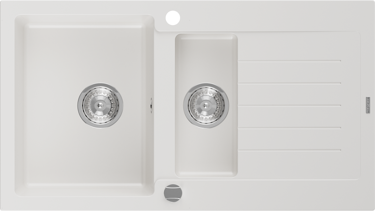 Mexen Matias granitinis kriauklė 1,5-kamerų su nuotėkiu 900 x 505 mm, baltas, chromuotas sifonas - 6502901505-20
