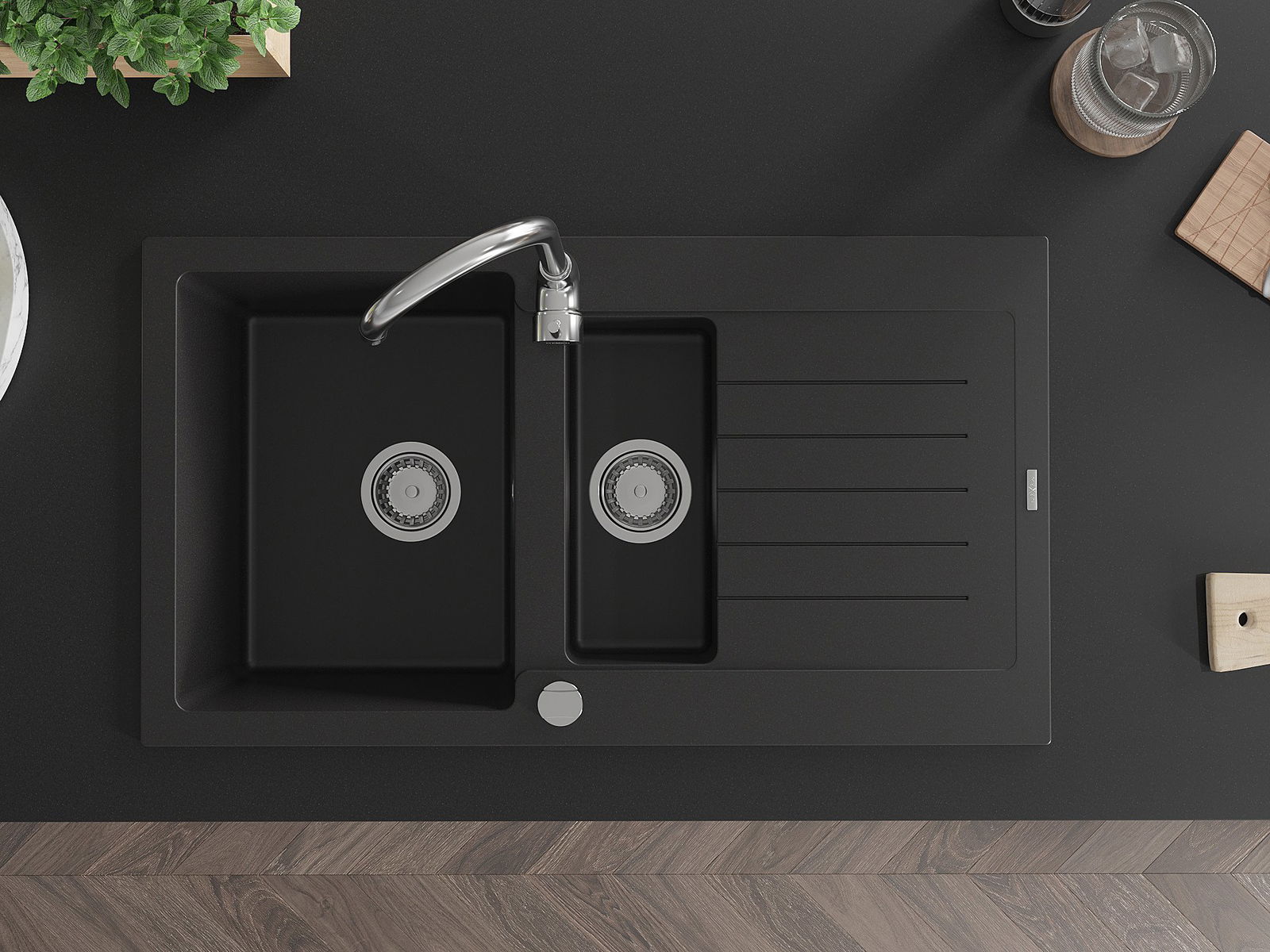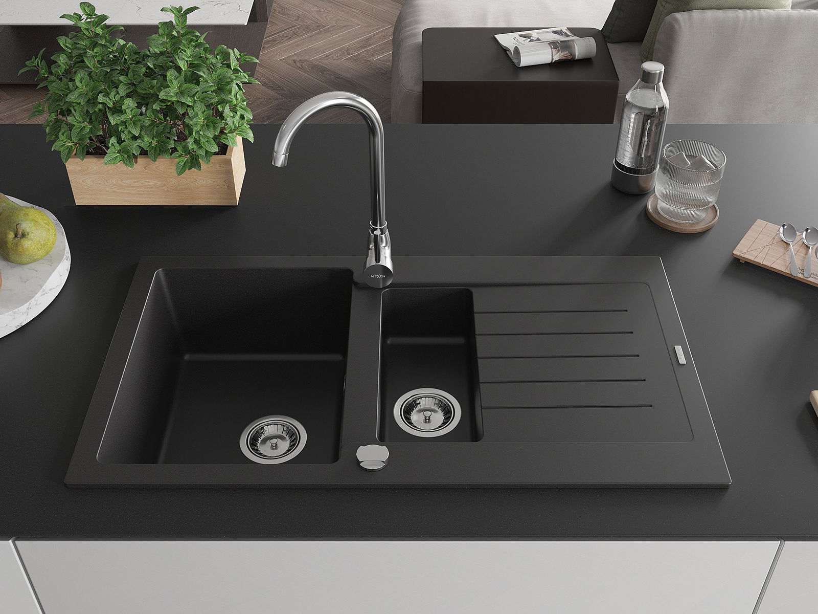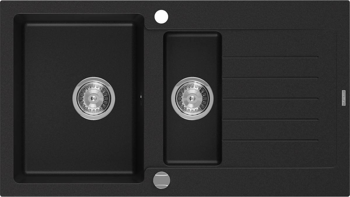 Mexen Matias granito plautuvė 1,5 kamerų su nutekėjimu 900 x 505 mm, juoda, chromuota sifoninė - 6502901505-77