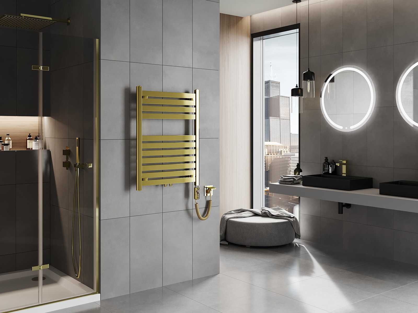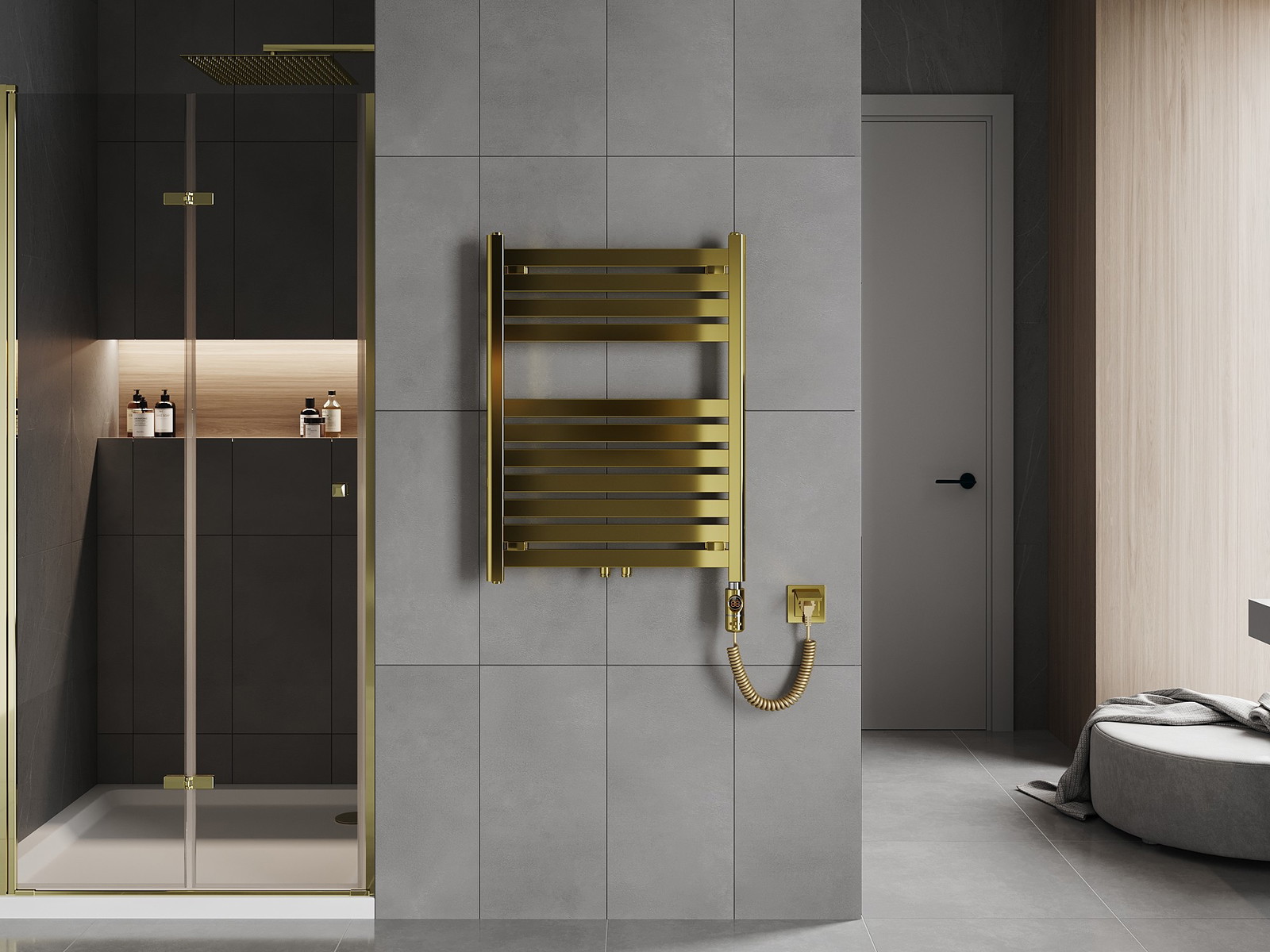Elektrinis radiatorius Mexen Uran – idealus sprendimas modernioms interjerams. Dėl elegantiško auksinio apdailos ir 800 x 600 mm matmenų jis puikiai tilps į bet kurią patalpą. Pagamintas iš plieno, siūlo 300 W galią ir yra aprūpintas 11 šildymo strypų, kurie užtikrina efektyvų šildymą. Inovatyvus jutiklinis valdymas su LED ekranu ir funkcijos, tokios kaip vaikų užraktas ir Comfort džiovinimo opcija, paverčia jį itin funkcionaliu. Dėl IP44 apsaugos lygio jis atsparus drėgmei, o termostatas palaiko pastovią temperatūrą. Komplekte yra laikikliai ir montavimo priedai. Reikalauja pripildyti vandeniu arba vandens ir glikolio mišiniu tinkamam veikimui.