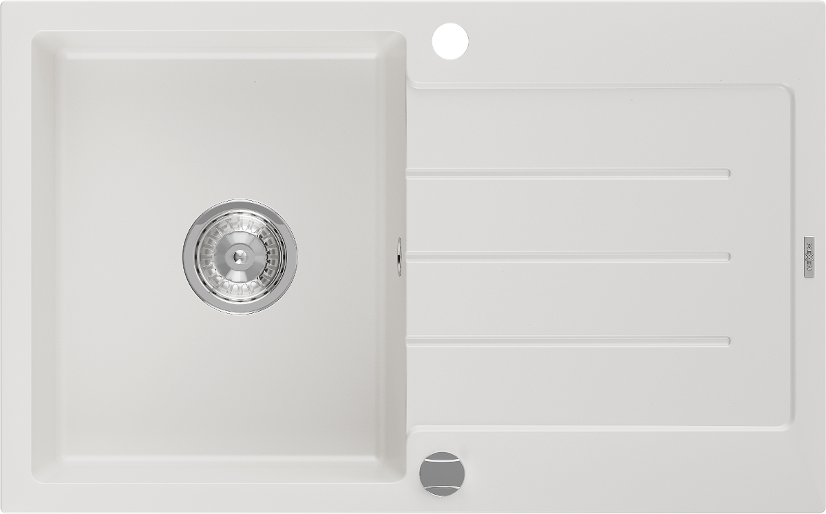 Mexen Bruno granitinė vienos kameros plautuvė su džiovinimo skyriumi 795 x 495 mm, balta, chrominis sifonas - 6513791010-20