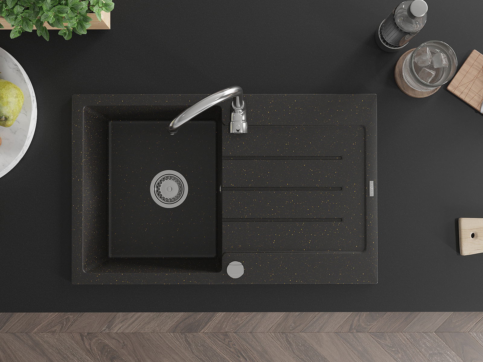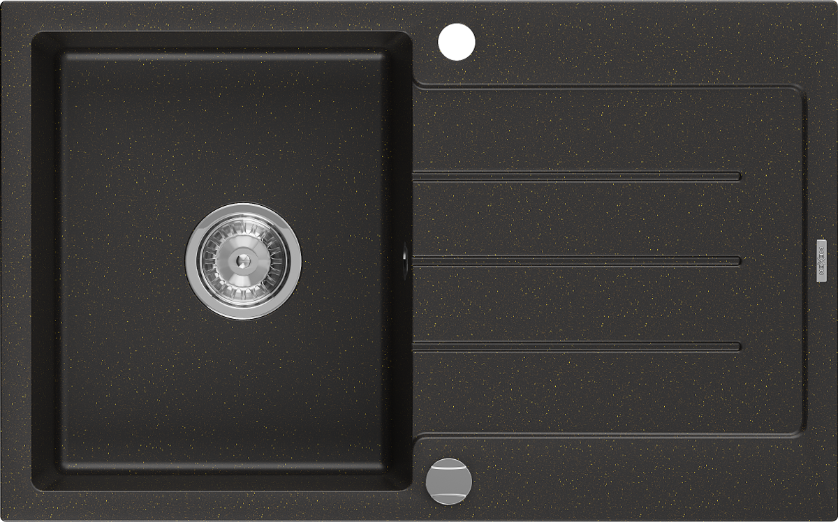 Mexen Bruno granitinė vienos kameros plautuvė su nubėgimu 795 x 495 mm, juoda/aukso metalo spalva, chromuotas sifonas