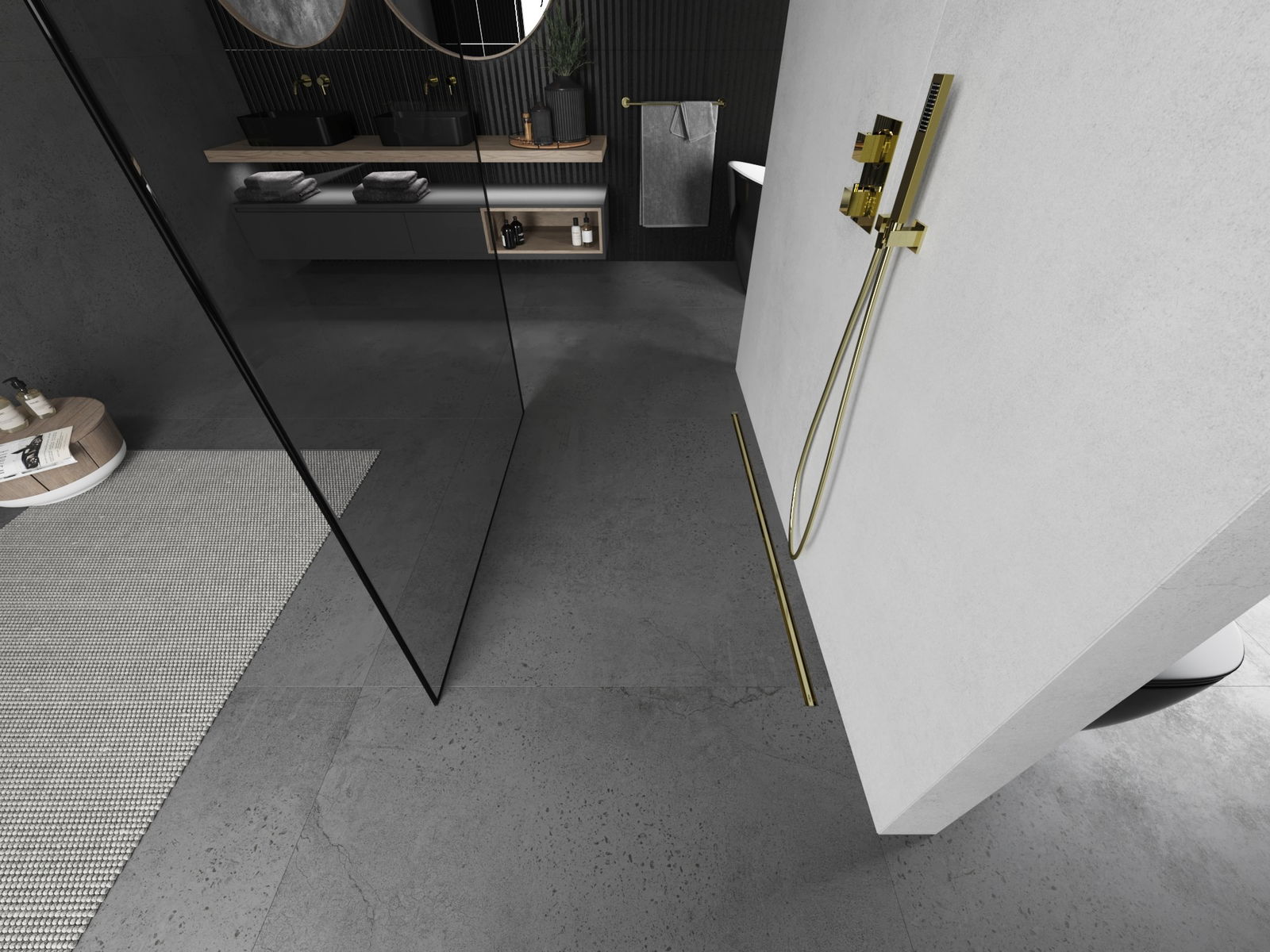 Mexen Kioto laisvai stovinti dušo sienelė 100 x 200 cm, juodi rėmai 8 mm, auksinė matinė - 800-100-002-55-70