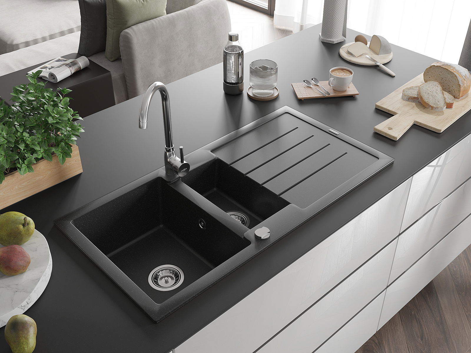 Mexen Andres granito kriauklė 1,5 skylių su stalviršiu 1000 x 500 mm, juodas/sidabrinis metalikas, chromuotas sifonas - 6515101?
