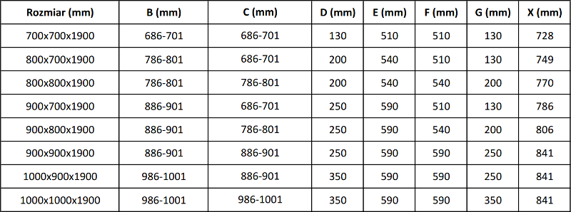 Dušo kabinos, durys ir sienelės yra standartiškai pritaikytos montuoti ant nustatytų matmenų dušo padėklų. Būtent šie matmenys nurodomi gaminio pavadinime arba aprašyme. Tačiau atkreipkite dėmesį, kad faktiniai elementų matmenys gali šiek tiek skirtis nuo vardinių verčių. Planuojant montuoti tiesiai ant grindų, rekomenduojama atidžiai patikrinti išorinius matmenis ir elementų išdėstymą pagal techninį brėžinį.