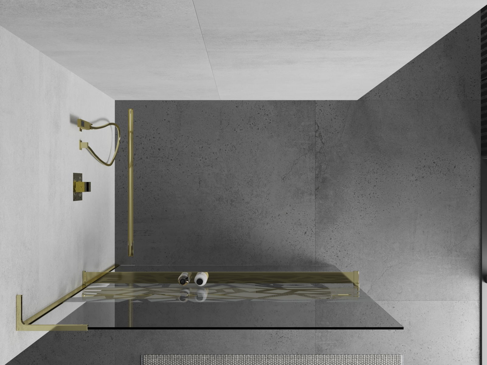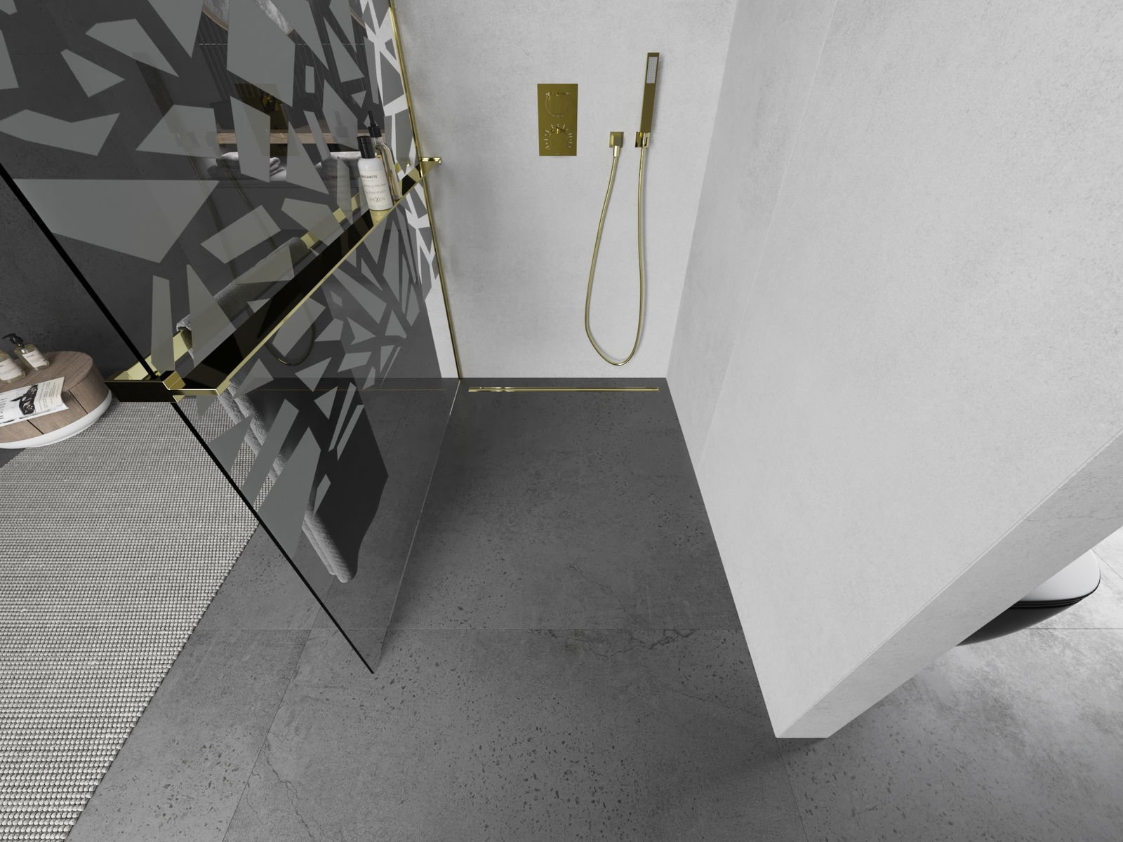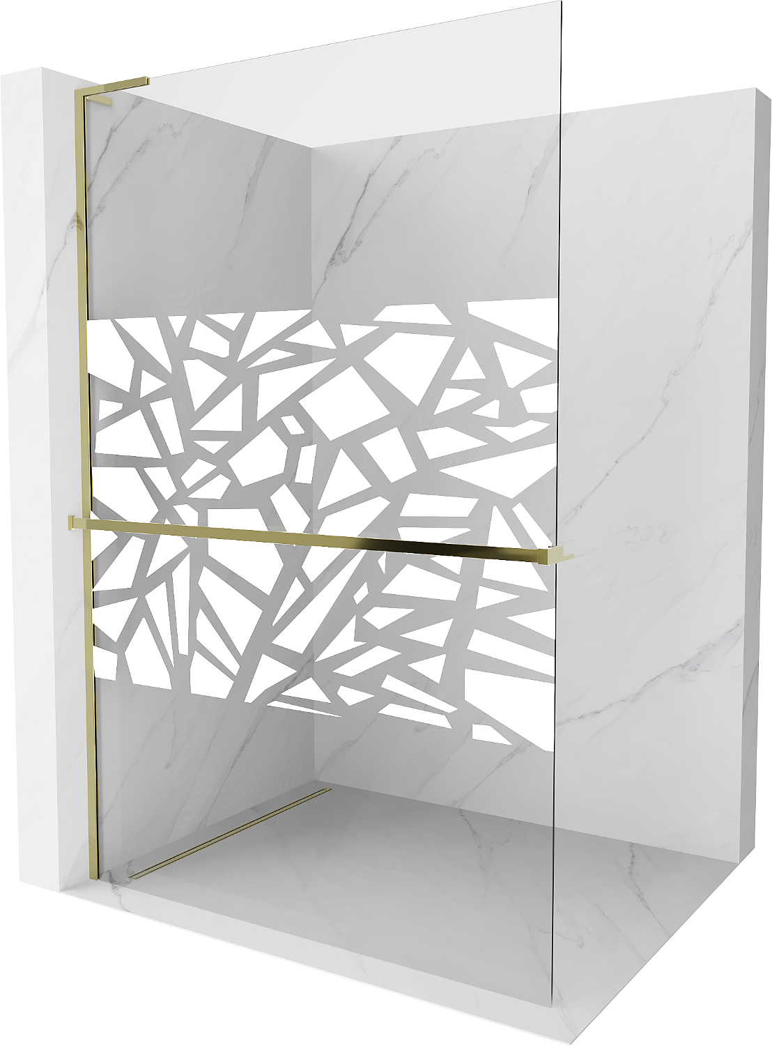 Mexen Kioto+ L dušo sienelė su lentyna Walk-in 90 x 200 cm, baltas raštas, auksinė - 800-090-123-50-85