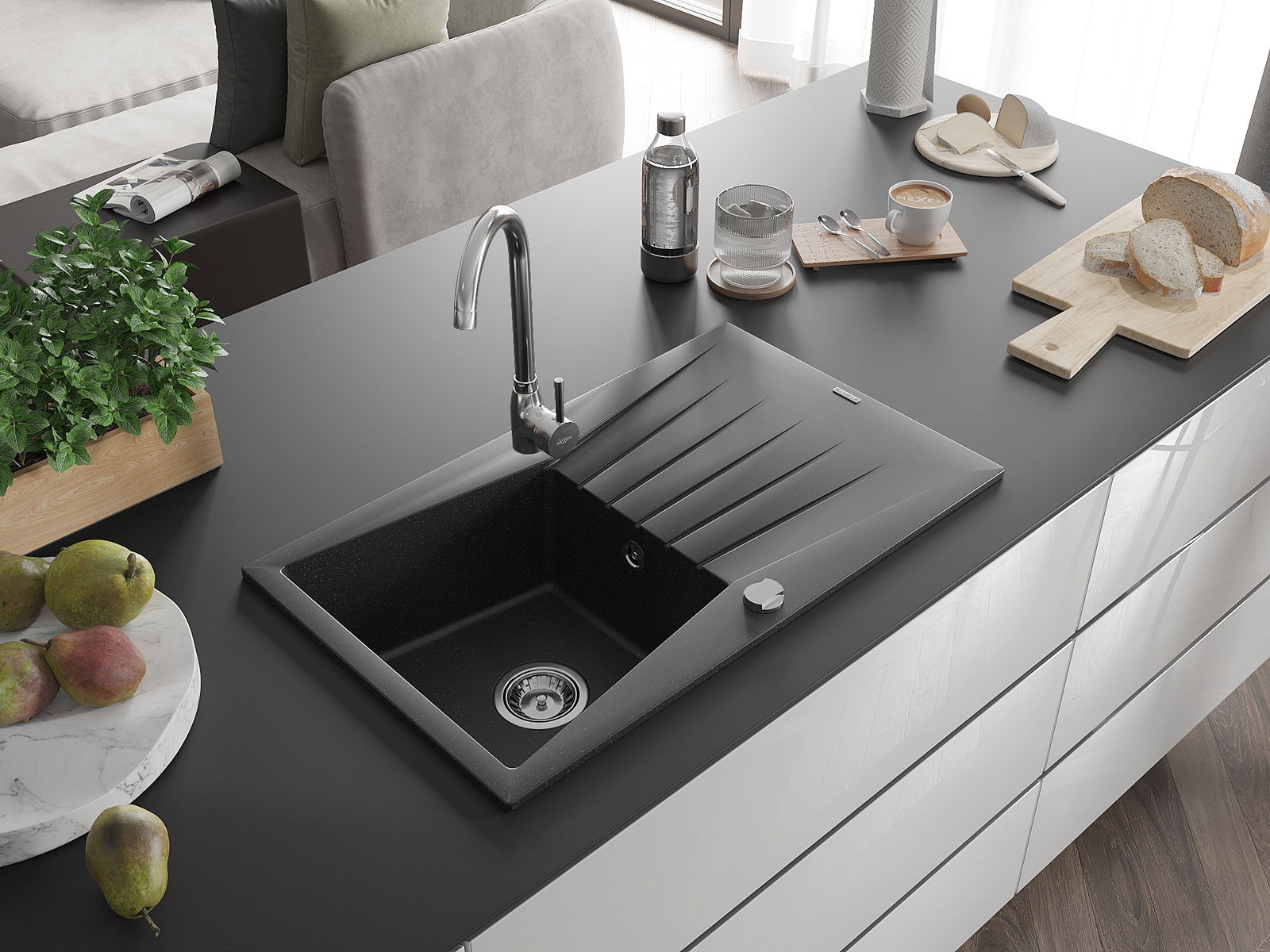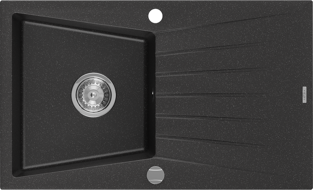 Mexen Cesar granitinė vienos kameros plautuvė su nusausintoju 775 x 470 mm, juoda/sidabrinė metalika, chromuotas sifonas