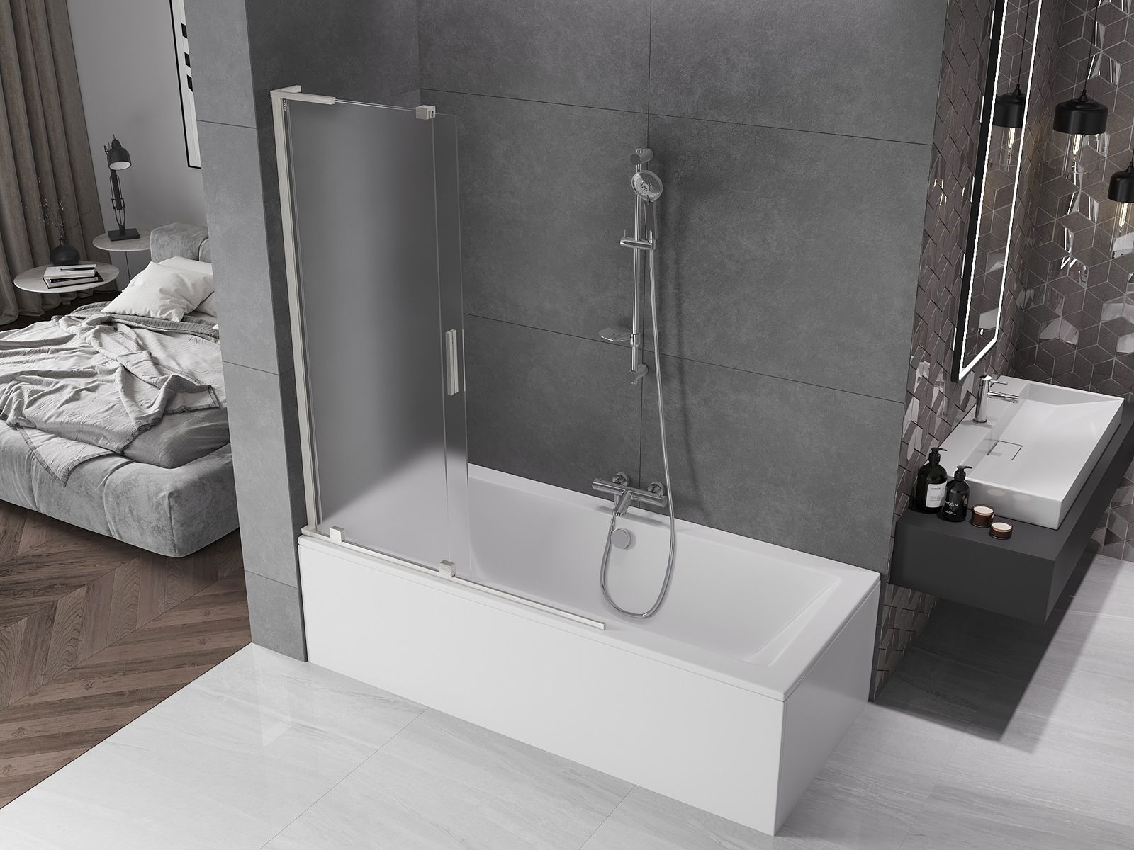Dėl universalios tvirtinimo sistemos, ekraną galima montuoti tiek dešinėje, tiek kairėje pusėje, priklausomai nuo poreikių. Tokiu būdu galite lengvai suprojektuoti dušą, pritaikytą vonios kambario erdvei.