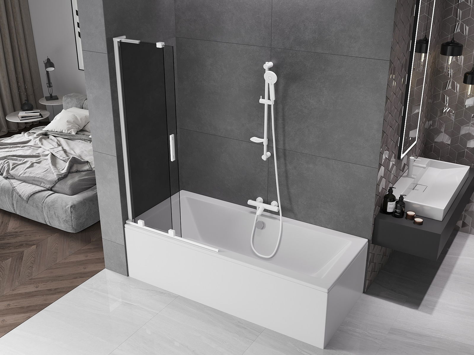 Dėl universalios tvirtinimo sistemos, ekraną galima montuoti tiek dešinėje, tiek kairėje pusėje, priklausomai nuo poreikių. Tokiu būdu galite lengvai suprojektuoti dušą, pritaikytą vonios kambario erdvei.