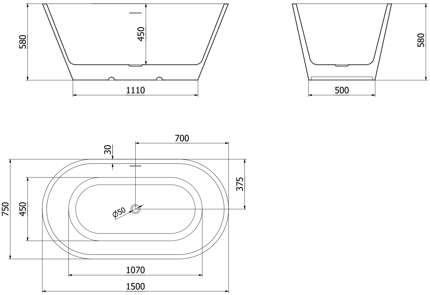 Mexen Luna laisvai stovinti vonia 150 x 75 cm, balta/juoda, perpildymo anglis šepečiu poliruota - 52031507575-66