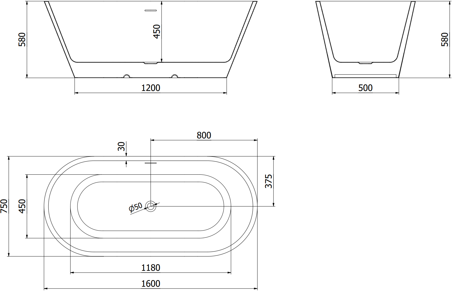Mexen Luna laisvai pastatoma vonia 160 x 75 cm, balta/juoda, persipylimas gun metal - 52031607575-95