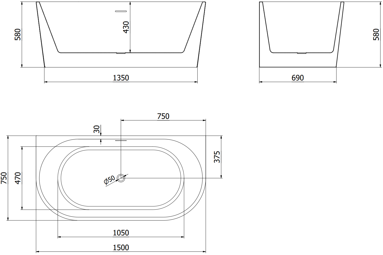 Mexen Oval laisvai stovinti prie sienos vonia 150 x 75 cm, balta/juoda, persipylimas ginklo pilkai šepetuotas - 52671507575-66