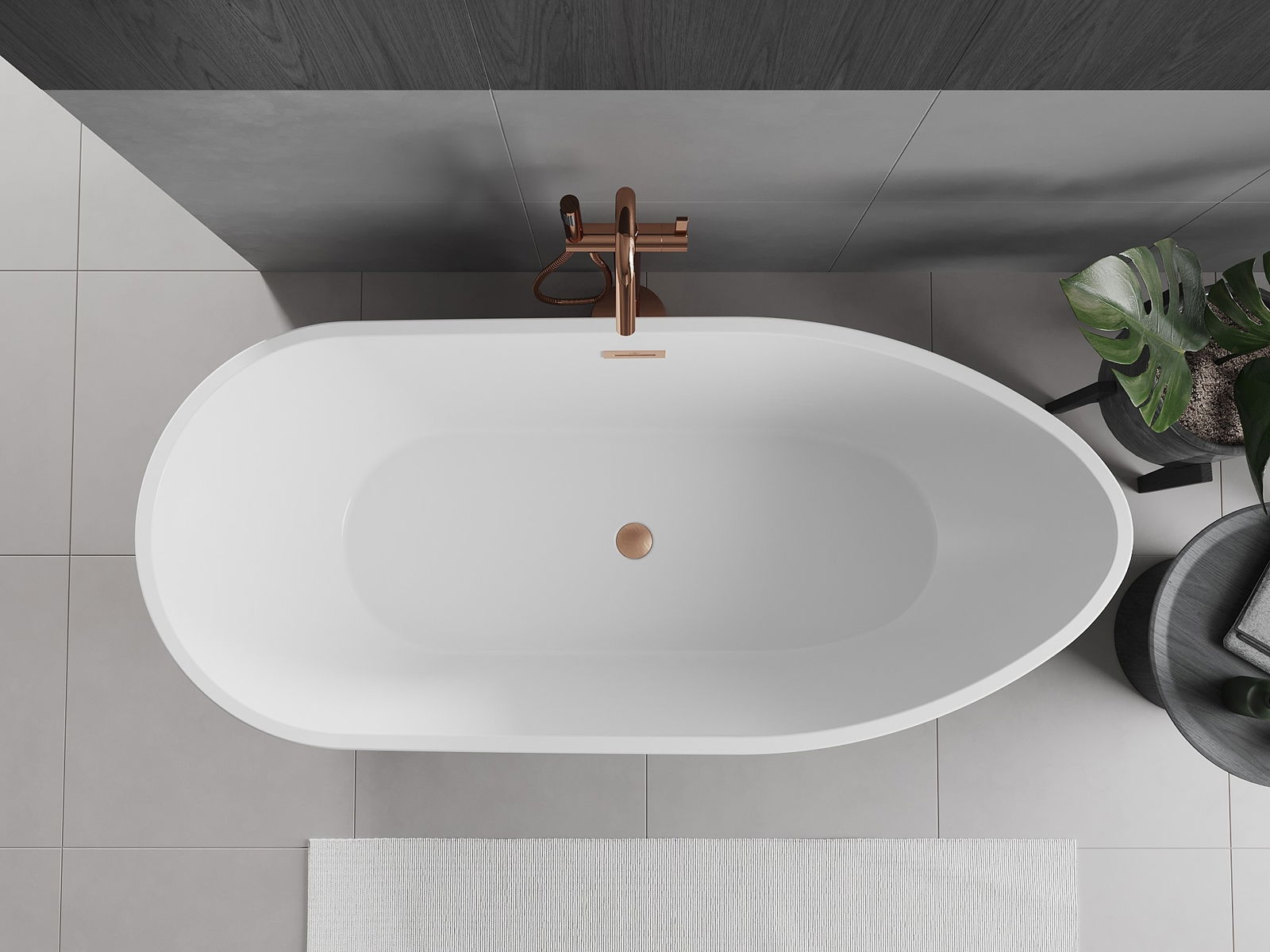 Mexen Eos yra elegantiška laisvai stovinti vonia, kurios matmenys 170 x 75 cm, pagaminta iš sanitarinio akrilo, prieinama stilingose baltos ir juodos spalvose. Dėl savo ovalios formos ir blizgaus paviršiaus ji puikiai tinka modernioms vonios kambariams. Ji turi persipylimo angą ir vidurinį nutekėjimą, kad būtų patogu naudoti. Be to, matinio vario apdaila ir atsparumas matinimui bei UV spinduliams užtikrina, kad produktas yra estetiškas ir ilgaamžis.