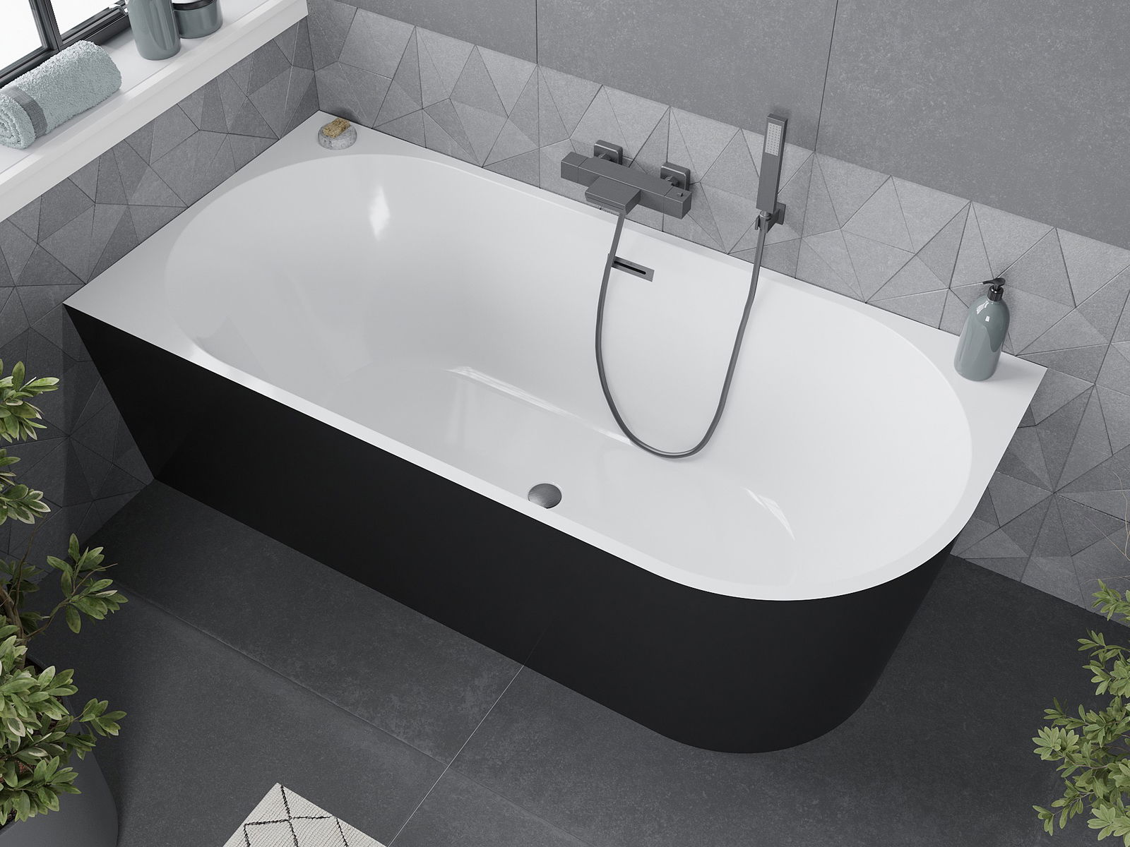 Mexen Mia laisvai pastatoma kampinė vonia kairinė 150 x 75 cm, balta/juoda, nutekėjimas pilkas šlifuotas - 52691507575L-66