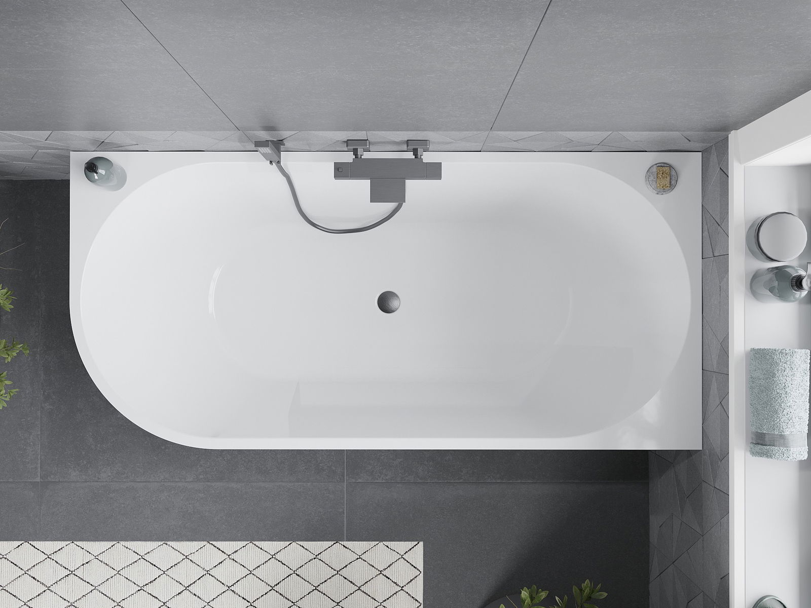 Mexen Mia laisvai pastatoma kampinė vonia dešinė 150 x 75 cm, balta/juoda, perpylimas ginklų pilka šepečiulu