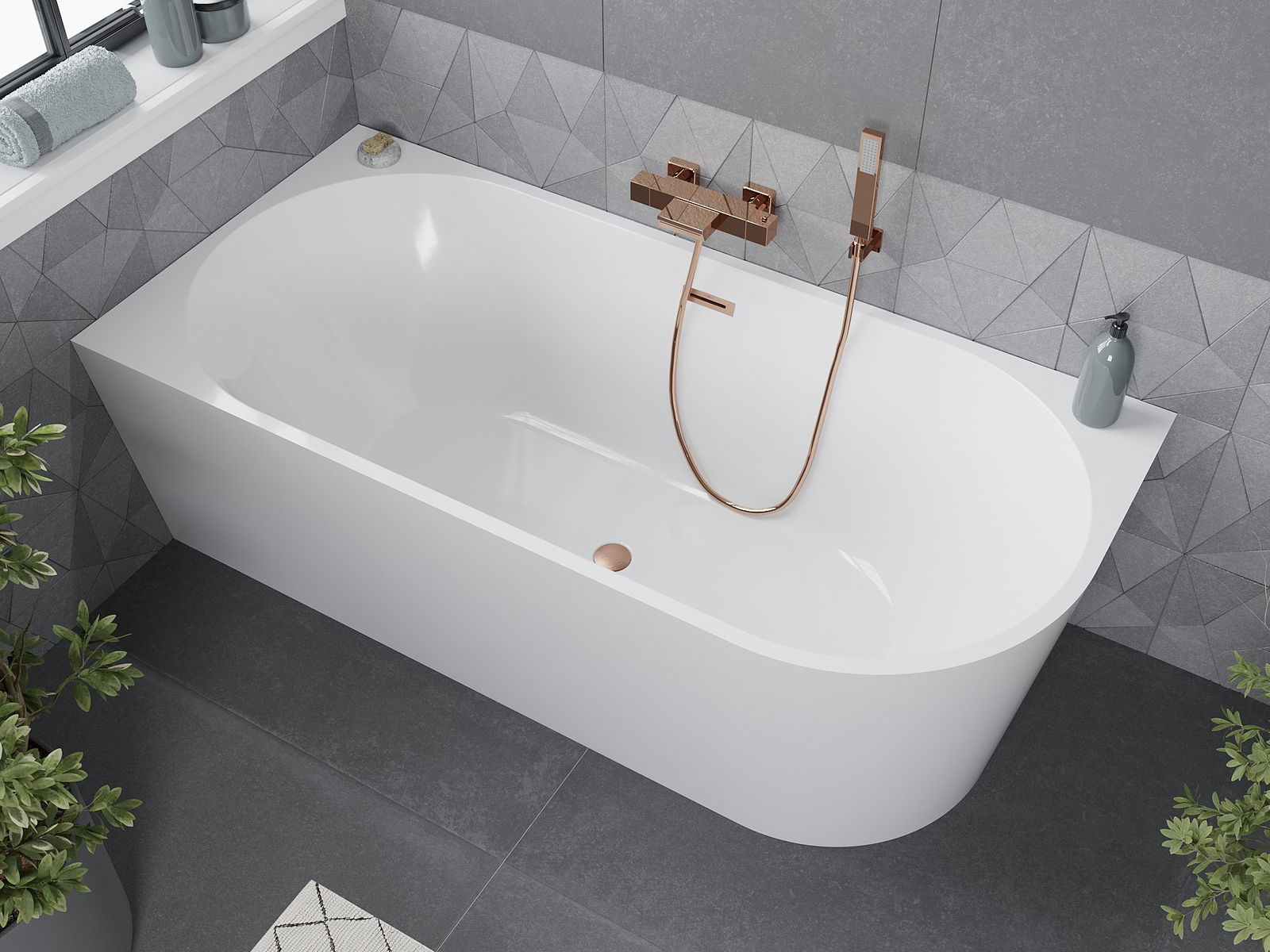 Mexen Mia yra elegantiška laisvai stovinti kampinė vonia, kurios matmenys yra 170 x 80 cm, kuri neabejotinai suteiks klasės kiekvienam vonios kambariui. Pagaminta iš sanitarinio akrilo, pasižymi atsparumu matinimui ir UV spinduliavimui, kuris užtikrina ilgaamžiškumą metų metais. Balta spalva ir šlifuoto vario apdaila puikiai dera modernių interjerų įrengimuose. Vonia turi praktišką perpildymo angą ir visiškai aprūpintą sifoną su paspaudžiamu uždarymo kamščiu, kas ją daro patogiu pasirinkimu vartotojams.