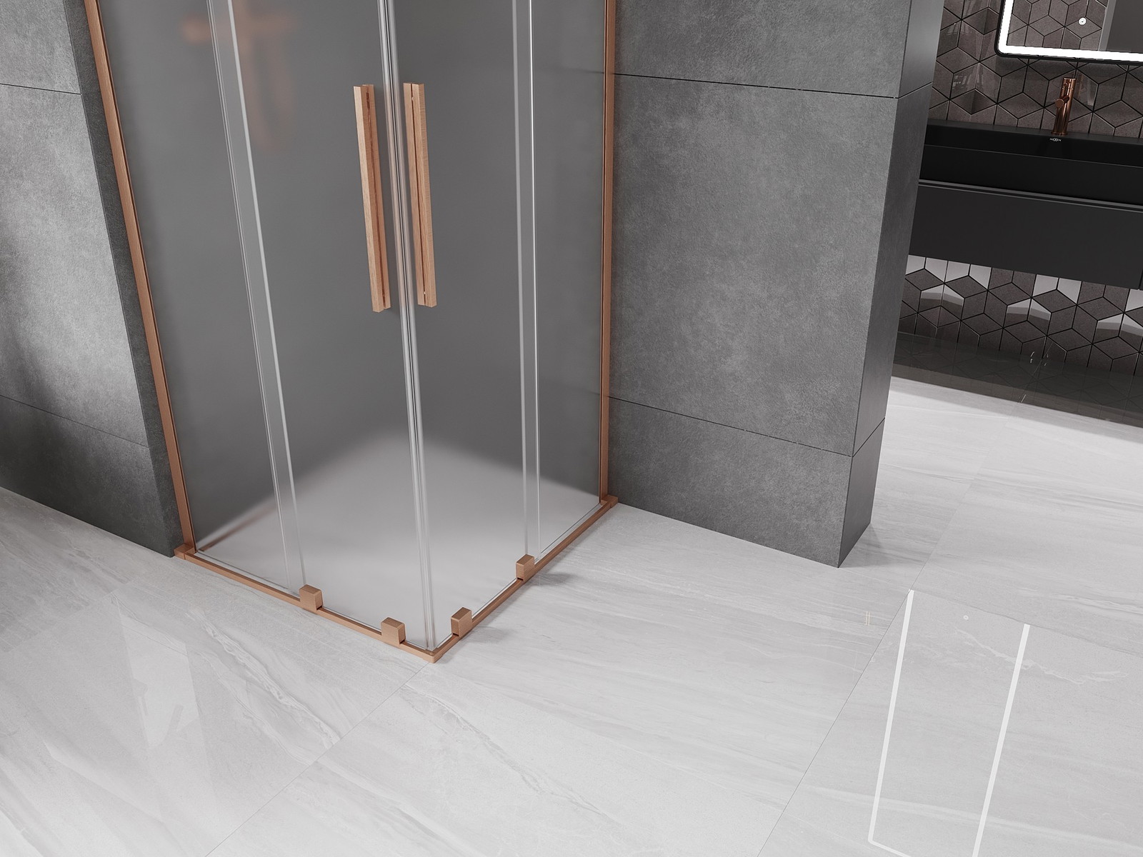 Mexen Velar L Dviguba dušo kabina, stumdomosios durys 90 x 90 cm, matinė, šlifuota varis - 871-090-090-02-33-65