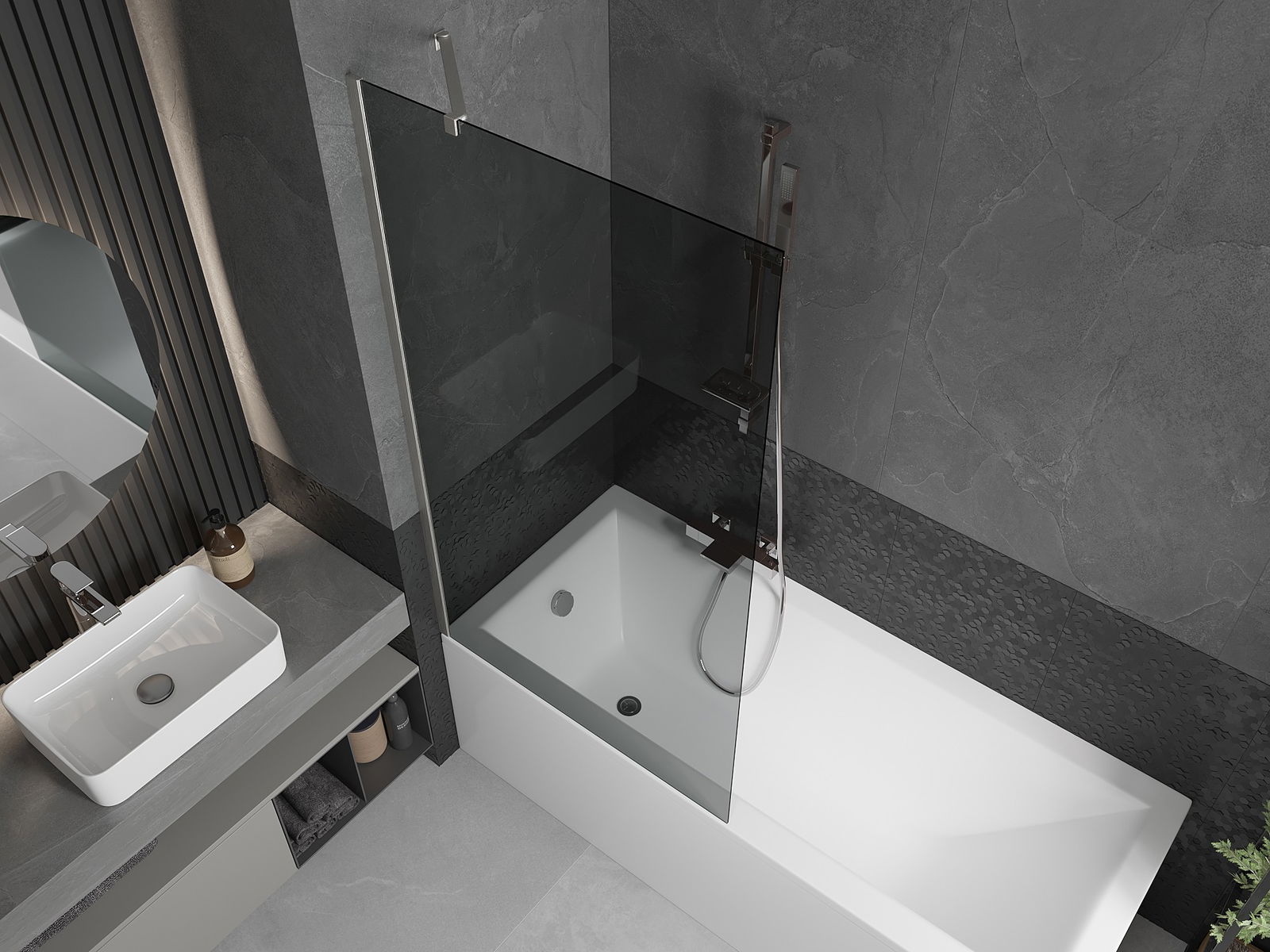 Efektyvi apsauga nuo vandens išsiliejimo maudymosi metu. Sienelė turi tarpines, kurios idealiai priglunda prie stiklo paviršiaus ir vonios krašto. Funkcionalus sprendimas, užtikrinantis saugumą ir lengvą švaros palaikymą.