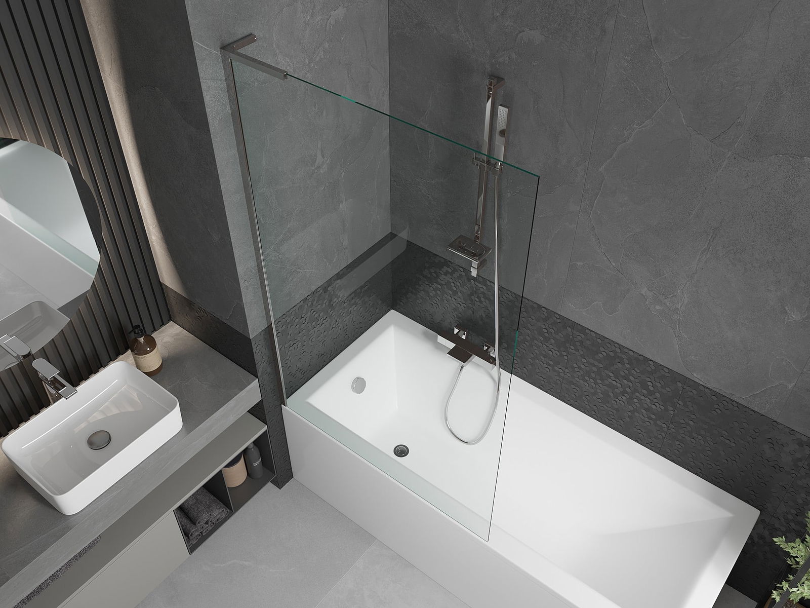 Efektyvi apsauga nuo vandens išsiliejimo maudymosi metu. Sienelė turi tarpines, kurios idealiai priglunda prie stiklo paviršiaus ir vonios krašto. Funkcionalus sprendimas, užtikrinantis saugumą ir lengvą švaros palaikymą.