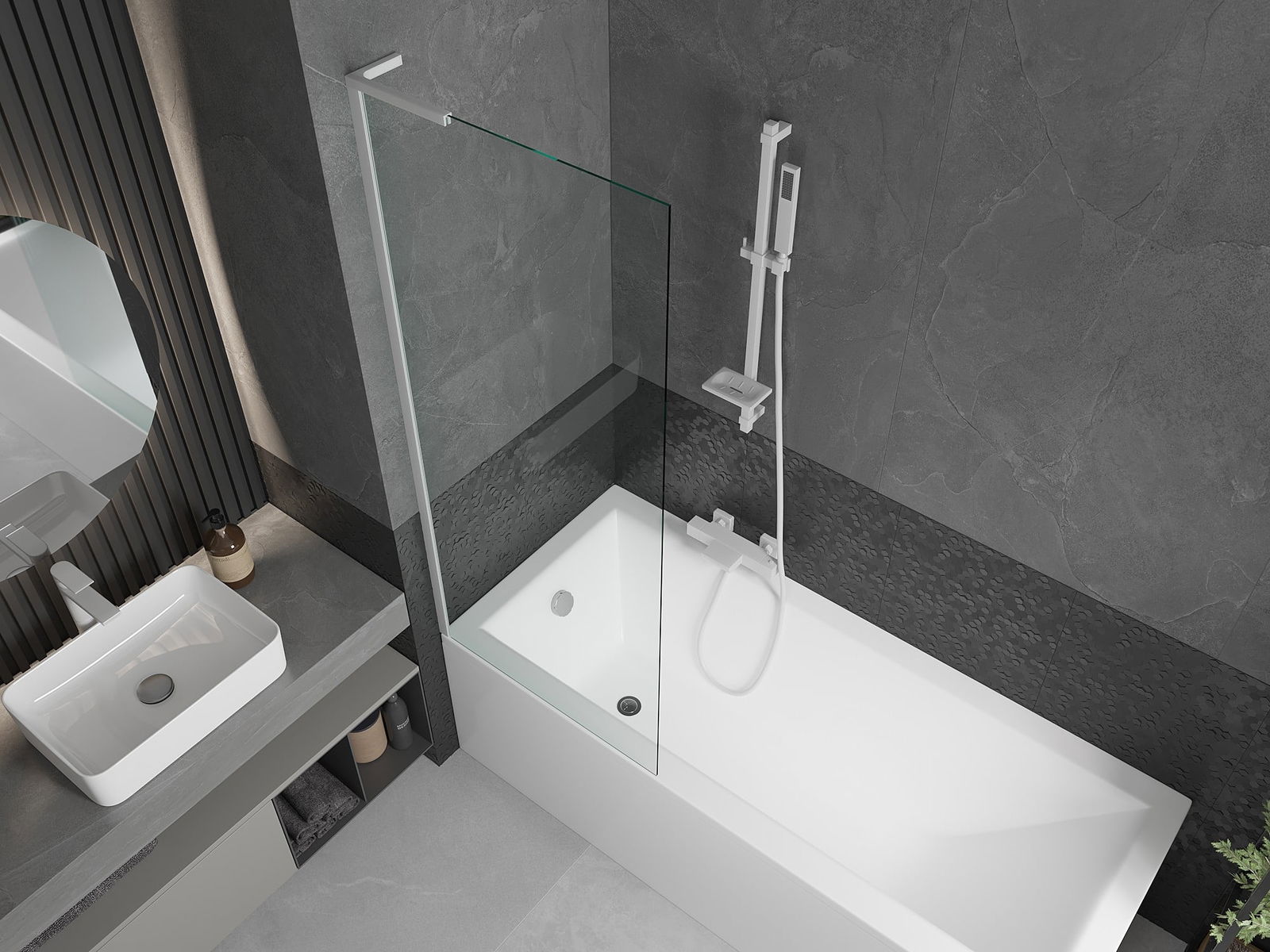 Efektyvi apsauga nuo vandens išsiliejimo maudymosi metu. Sienelė turi tarpines, kurios idealiai priglunda prie stiklo paviršiaus ir vonios krašto. Funkcionalus sprendimas, užtikrinantis saugumą ir lengvą švaros palaikymą.