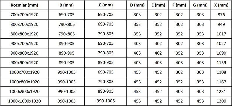 Dušo kabinos, durys ir sienelės yra standartiškai pritaikytos montuoti ant nustatytų matmenų dušo padėklų. Būtent šie matmenys nurodomi gaminio pavadinime arba aprašyme. Tačiau atkreipkite dėmesį, kad faktiniai elementų matmenys gali šiek tiek skirtis nuo vardinių verčių. Planuojant montuoti tiesiai ant grindų, rekomenduojama atidžiai patikrinti išorinius matmenis ir elementų išdėstymą pagal techninį brėžinį.