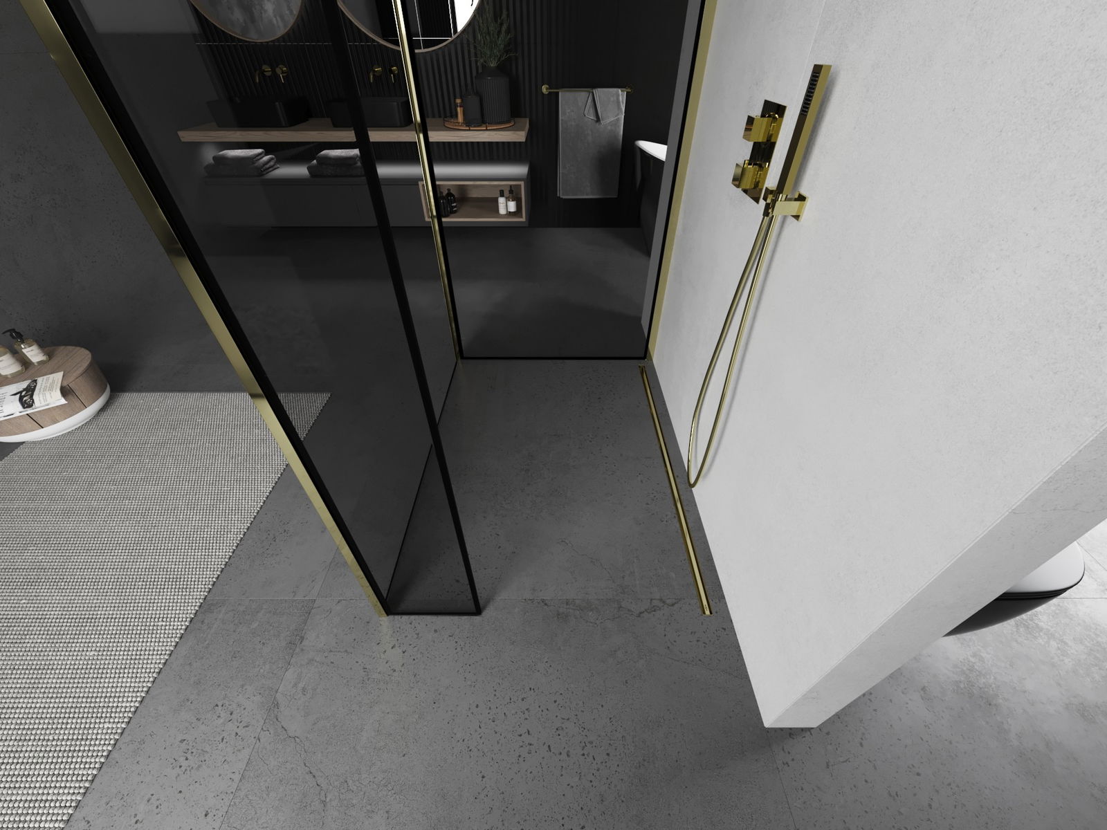 Mexen Kioto dušo siena Walk-in 110 x 90 x 40 cm, juodas rėmelis, auksinė - 800-110-090-221-50-70-040