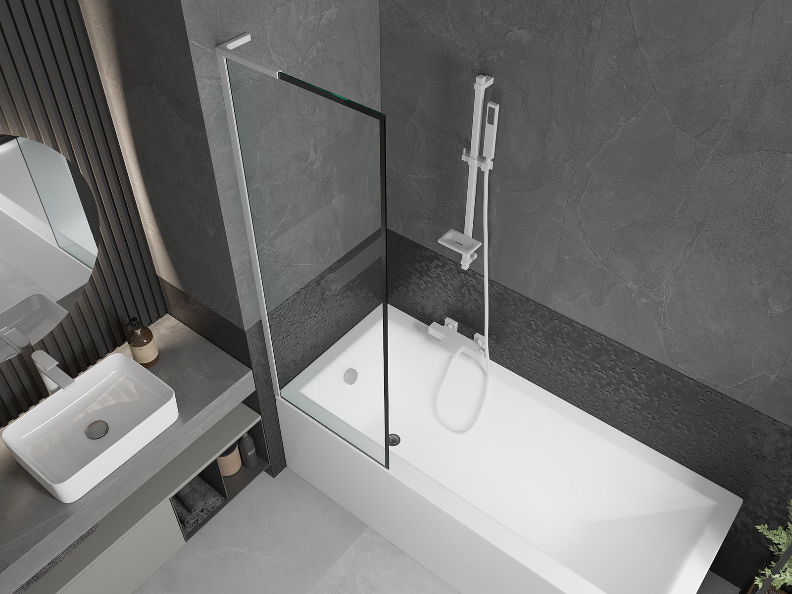 Efektyvi apsauga nuo vandens išsiliejimo maudymosi metu. Sienelė turi tarpines, kurios idealiai priglunda prie stiklo paviršiaus ir vonios krašto. Funkcionalus sprendimas, užtikrinantis saugumą ir lengvą švaros palaikymą.